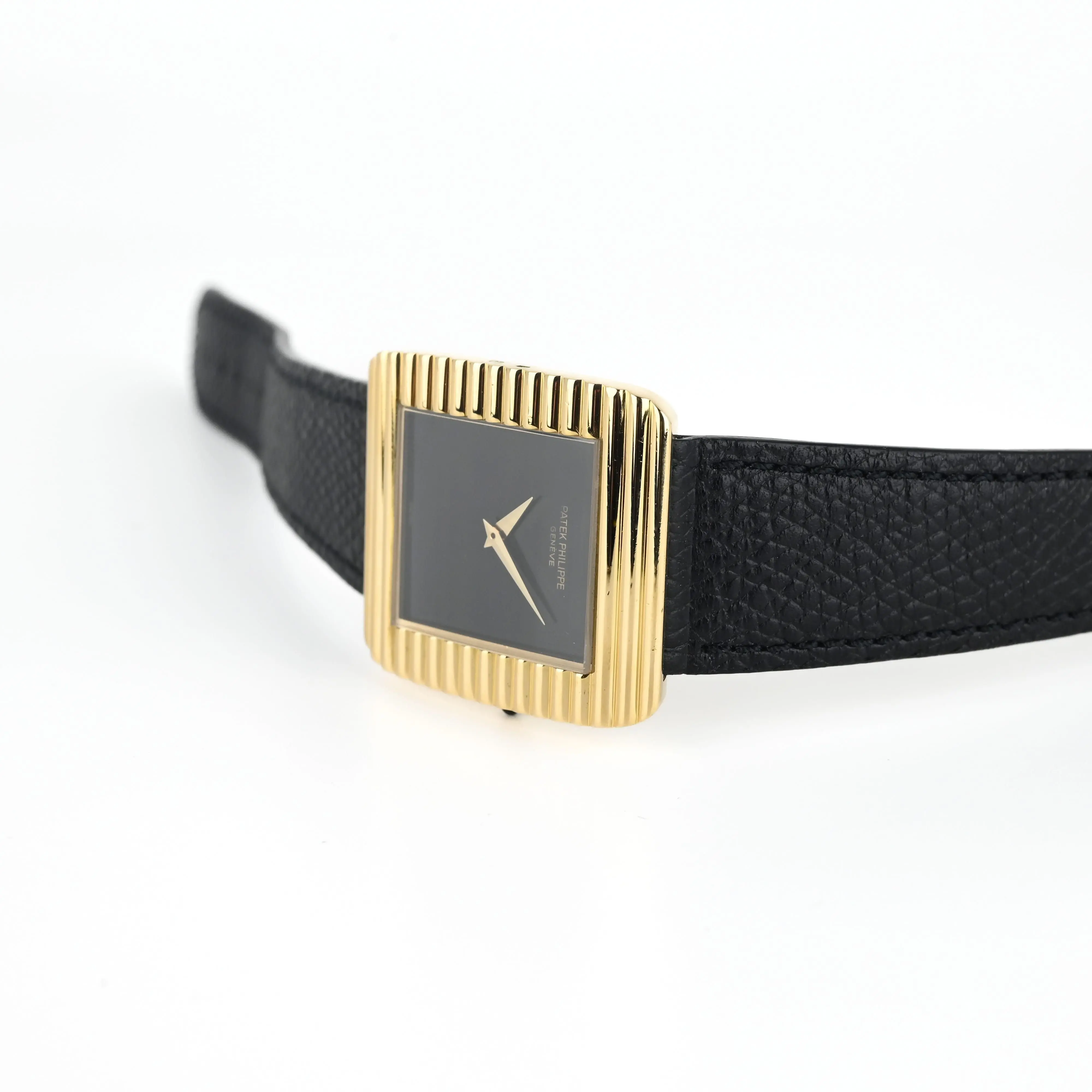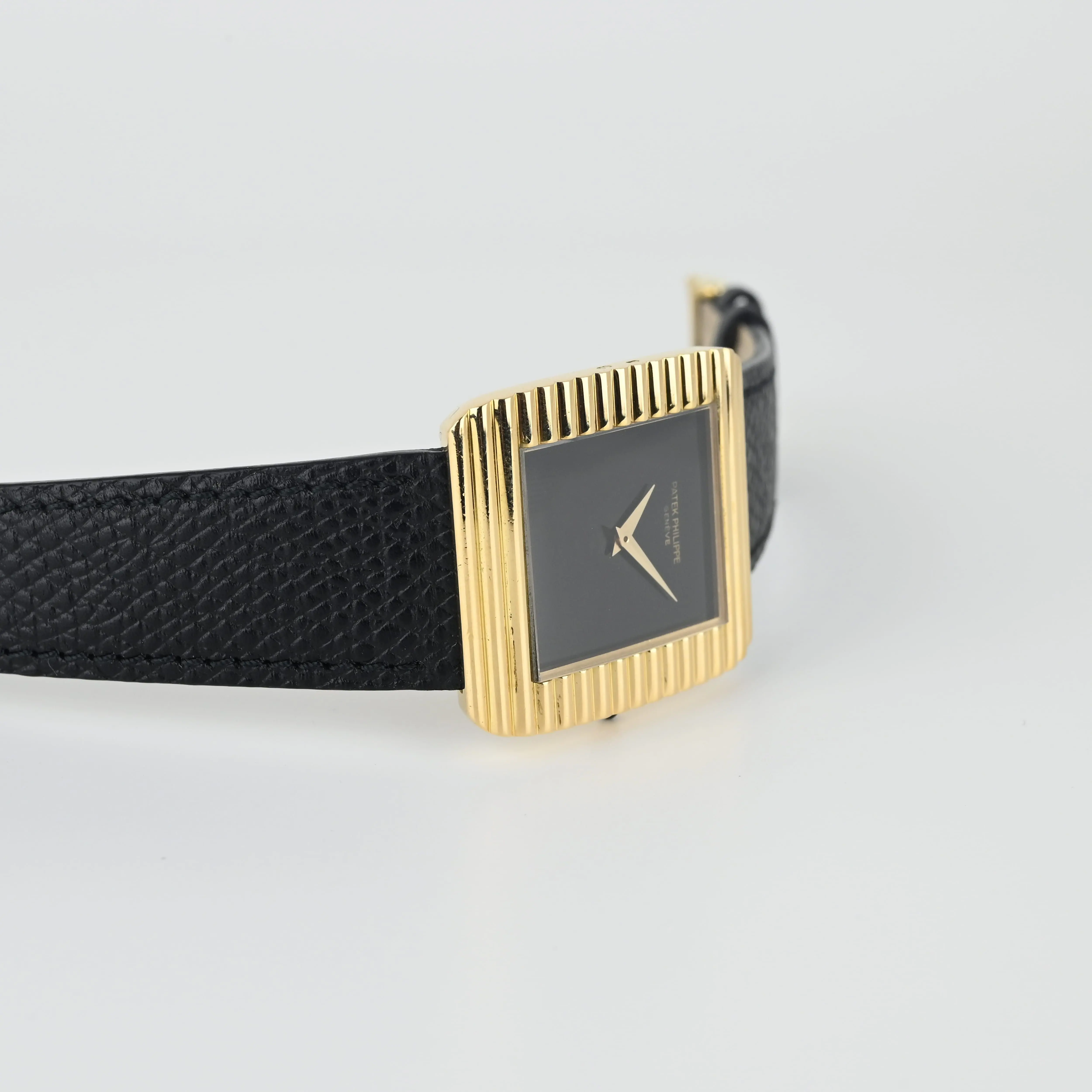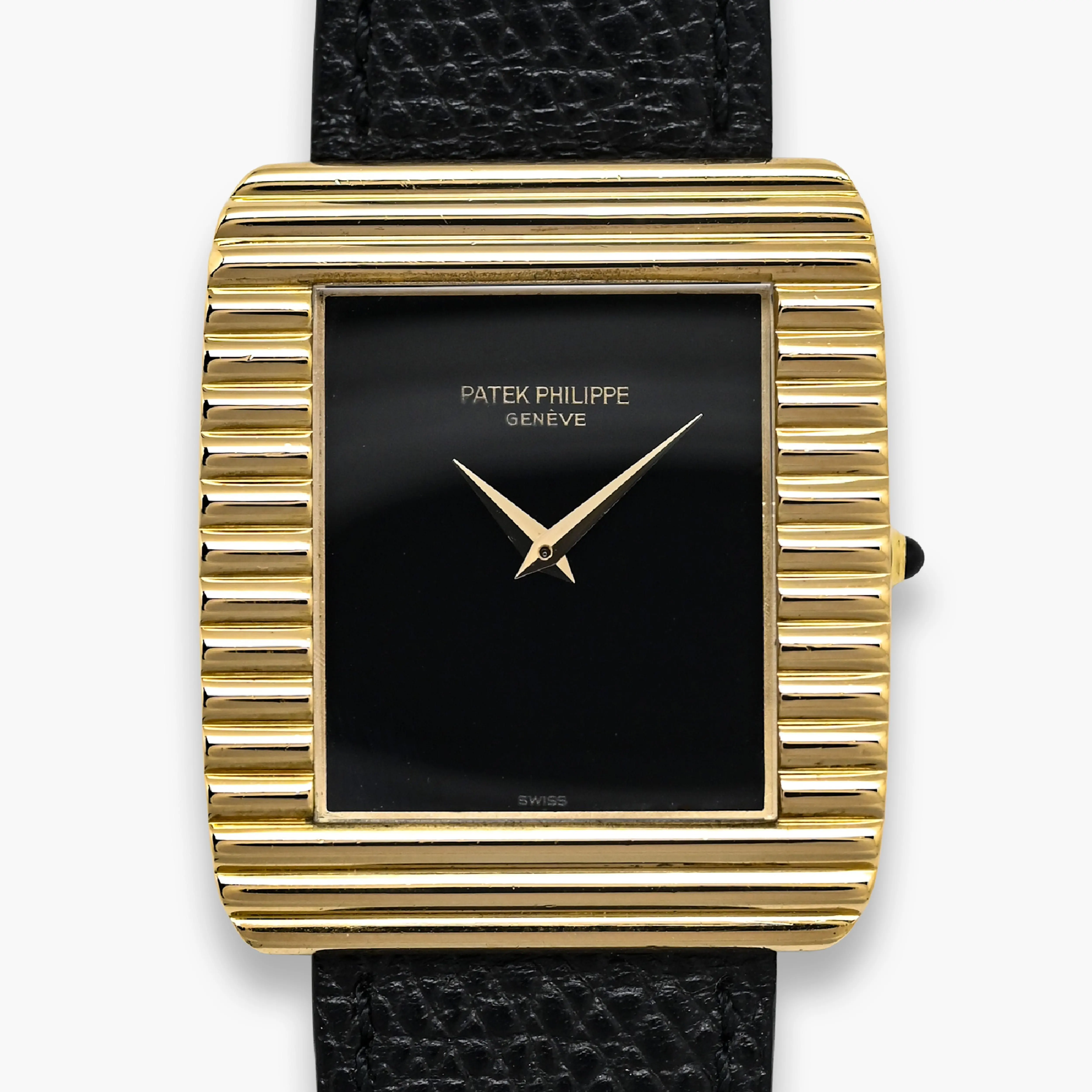 Patek Philippe Vintage Ref. 3633 we have here features a rectangular case (29 x 34 mm) with horizontal fluting. A version with a removable bracelet exists for this reference, unlike the Ref. 3733, which has a fixed bracelet. This atypical design, both simple and complex, balances superbly with the naturally minimalist onyx dial. The dial contrasts with the yellow gold of the case and highlights the dauphine hands for perfect time-reading. Ultra-thin manual-winding Caliber 177, a derivative of Frederic Piguet’s Caliber 21 with apower reserve of approximately 42 hours.