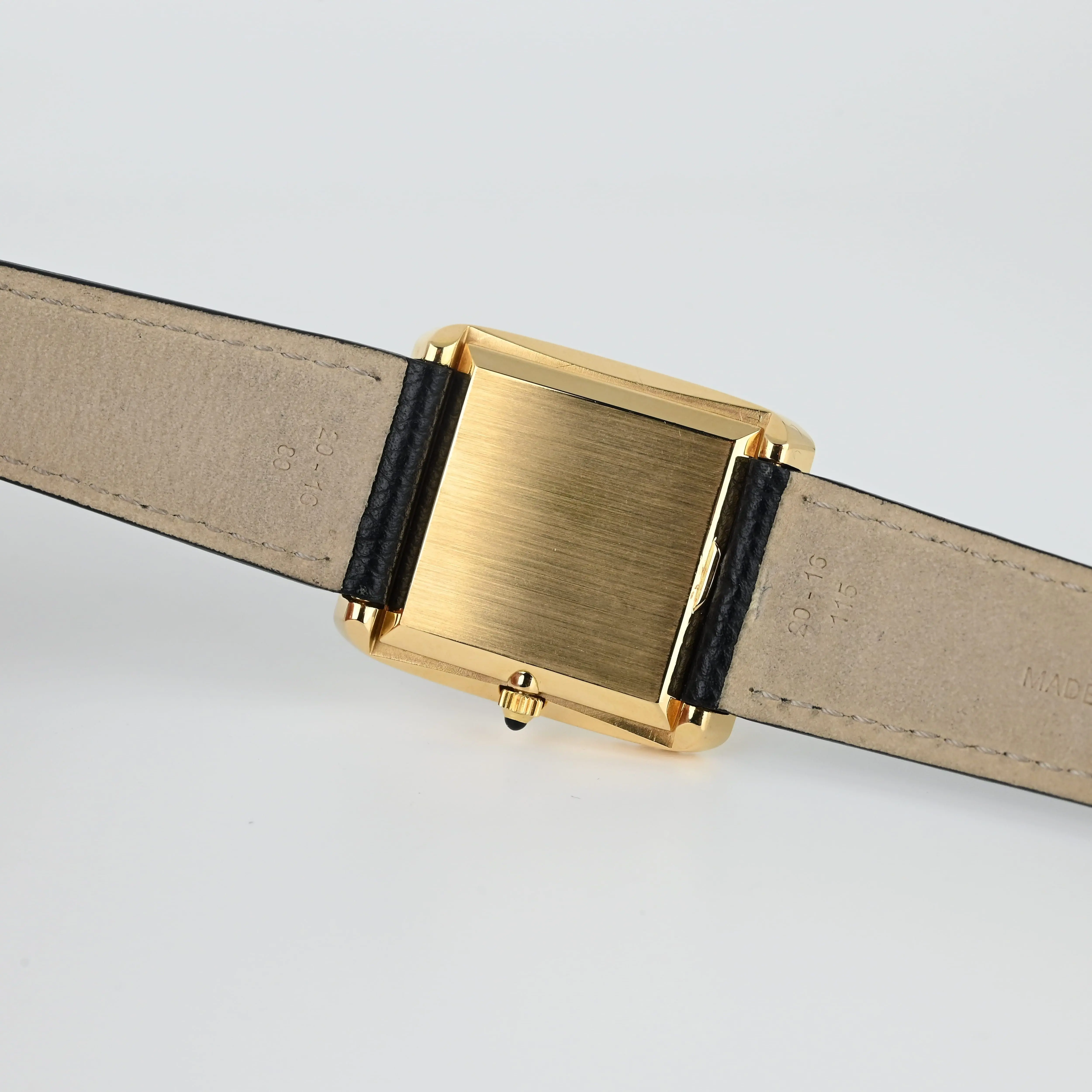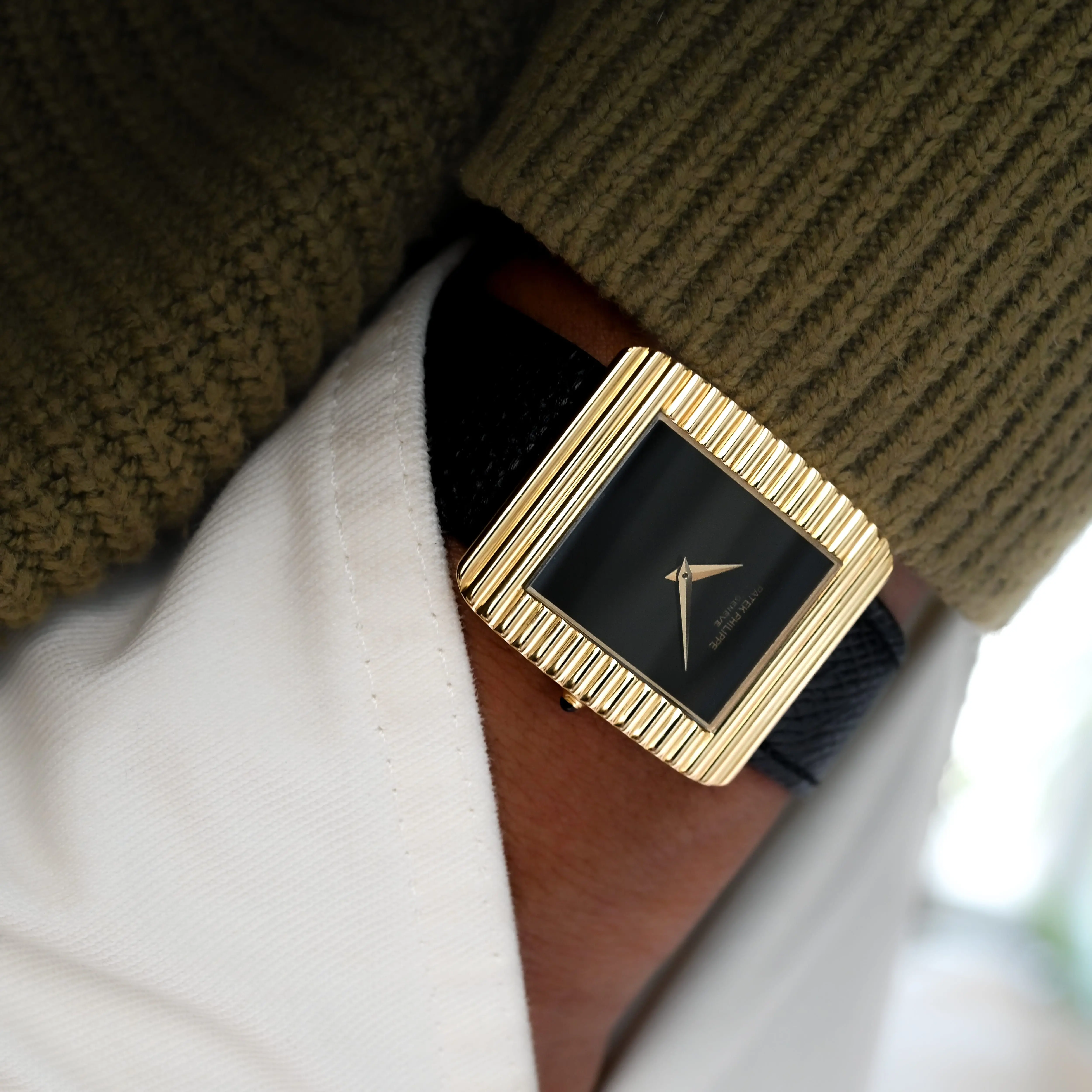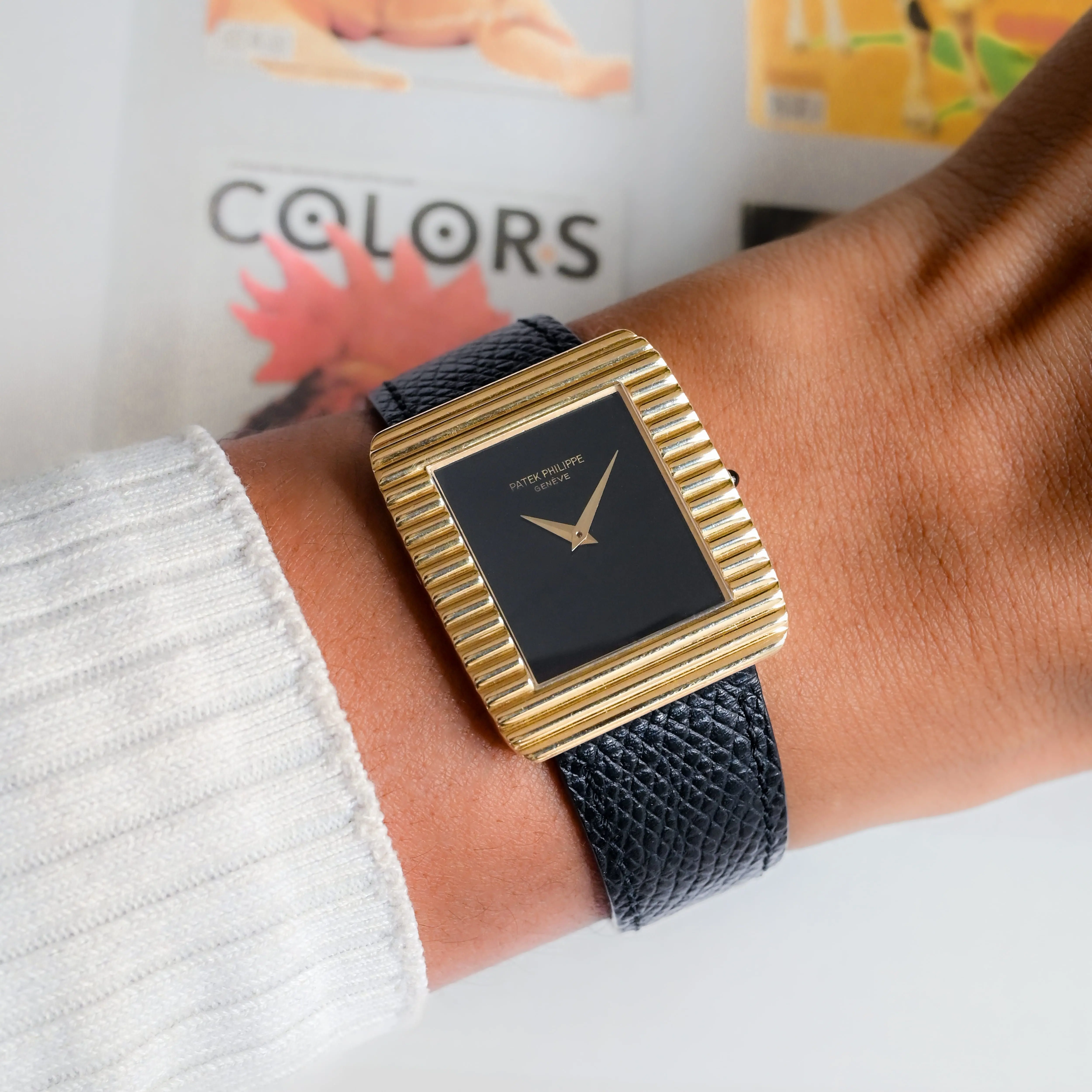 Patek Philippe Vintage Ref. 3633 we have here features a rectangular case (29 x 34 mm) with horizontal fluting. A version with a removable bracelet exists for this reference, unlike the Ref. 3733, which has a fixed bracelet. This atypical design, both simple and complex, balances superbly with the naturally minimalist onyx dial. The dial contrasts with the yellow gold of the case and highlights the dauphine hands for perfect time-reading. Ultra-thin manual-winding Caliber 177, a derivative of Frederic Piguet’s Caliber 21 with apower reserve of approximately 42 hours.