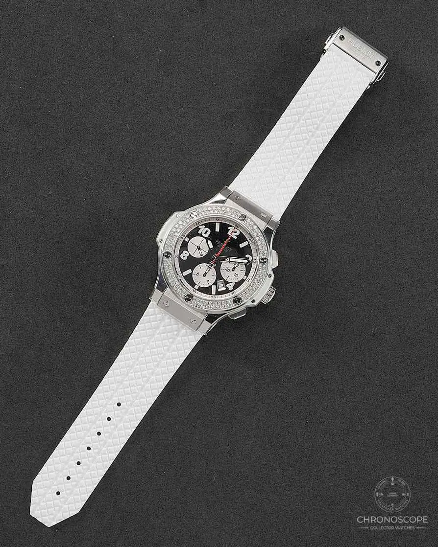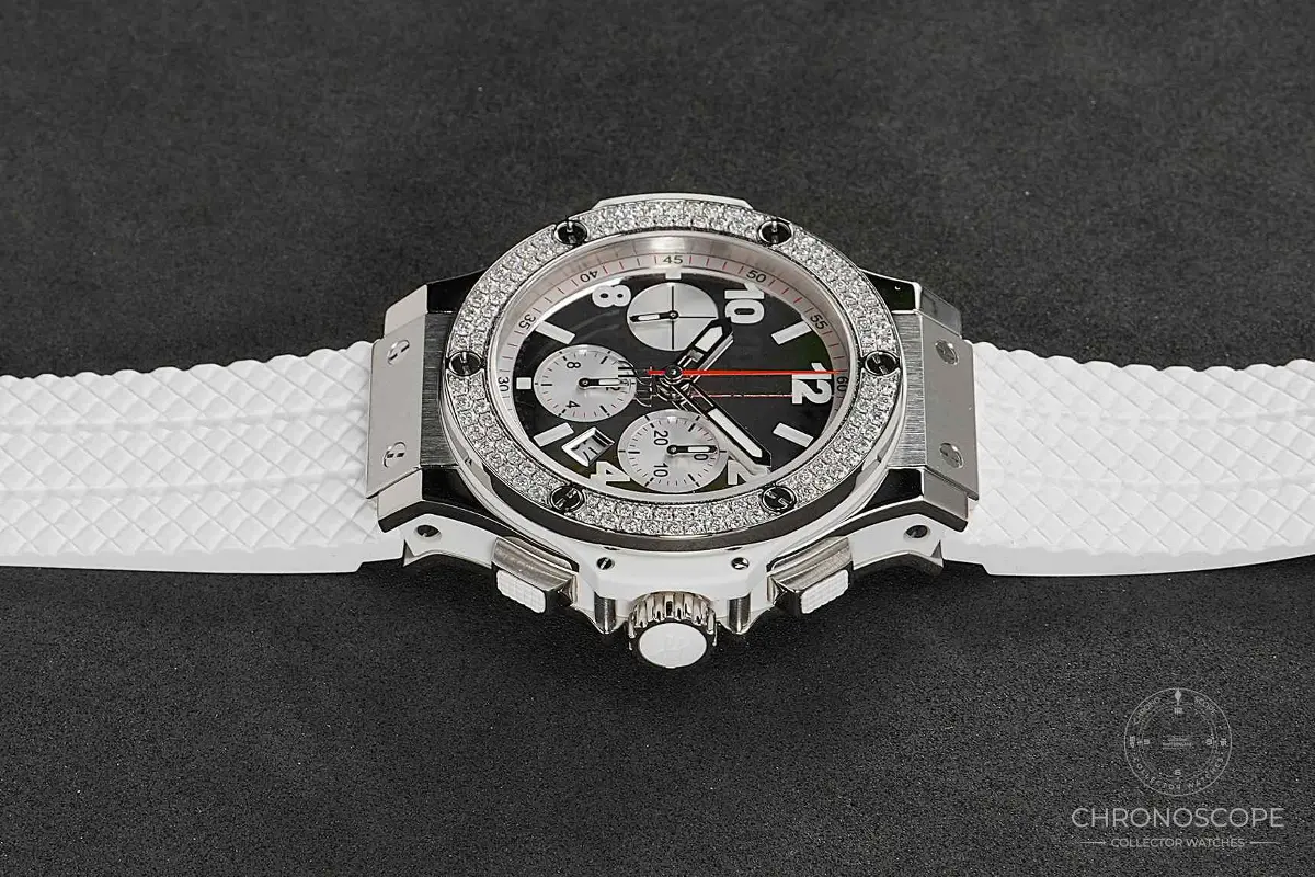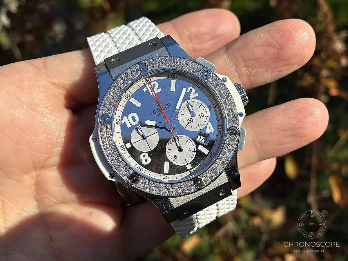Hublot Big Bang St. Moritz Ref. 301.SE.230.RW.114 ceramic with factory-set diamonds. The Hublot Big Bang St. Moritz is a striking luxury chronograph that exemplifies the brand’s fusion of bold design, innovative materials, and Swiss craftsmanship. 44 mm, Case Thickness: 14.5 mm Bezel: Fixed, set with diamonds Crystal: Scratch-resistant Sapphire