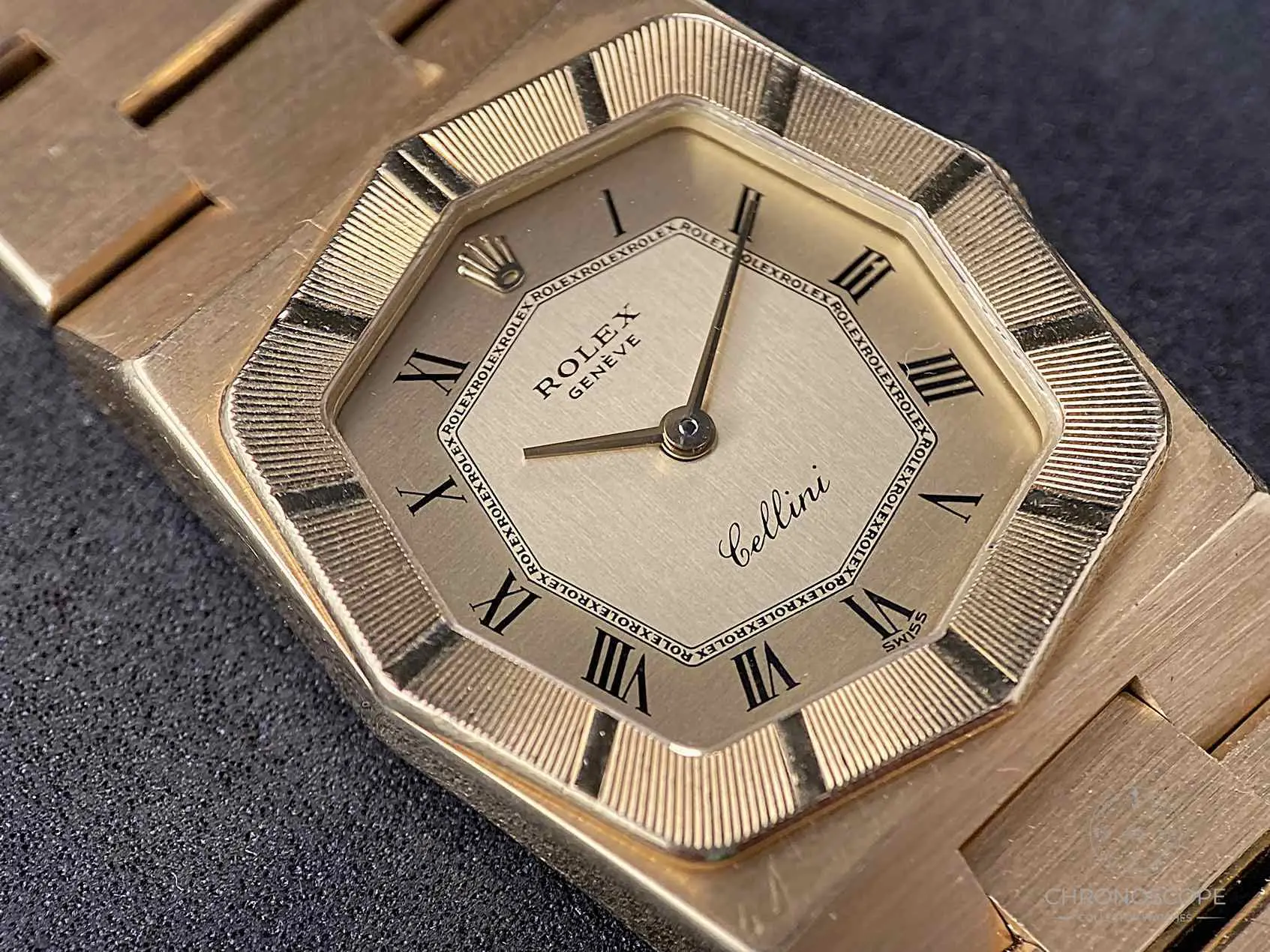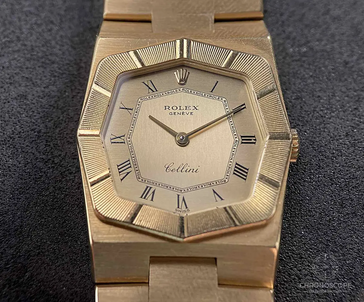 Rolex Cellini Vintage Ref. 4360 with a yellow gold case. When Rolex went out of the box, it created the reference 4360 Cellini, a feast of geometry wrapped in gold. A bold expression of elegance that still feels strikingly relevant today. The angular, 18k yellow gold case isapprox. 25mm wide and 32 mm from tip to tip. At around 5.5 mm, the case is very thin. In-house Cal. 1601 mechanical movement.