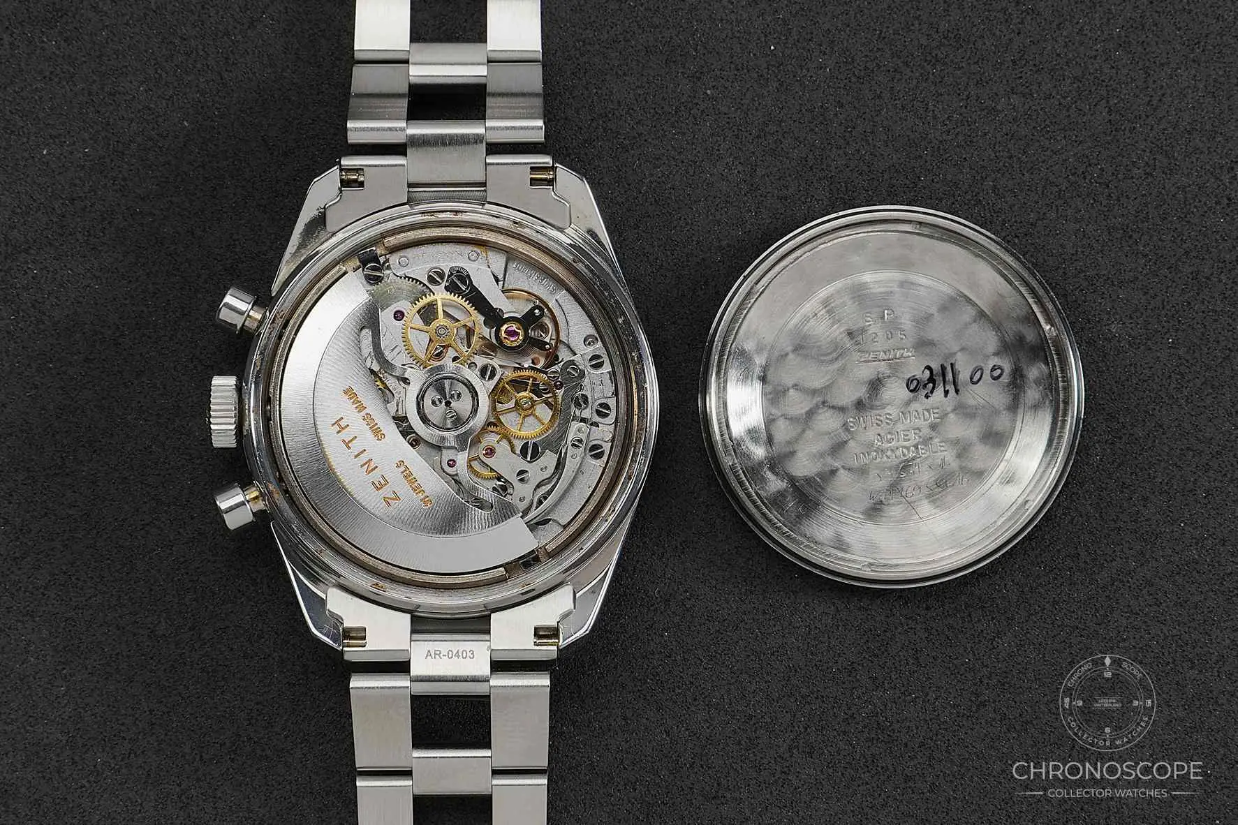 Zenith Chronomaster Ref A386 case size 38 mm in stainless steel. Caliber 3019 PHC Automatic. What would become the template for ZENITH’s signature CHRONOMASTER line, the A386 was launched in 1969 in a more classical round-case with straight lugs. It stood out with its tri-colour chronograph counters and decimal scale, becoming one of the most significant references in the history of the El Primero calibre and an icon among chronograph wristwatches.