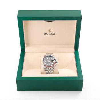 The Rolex GMT-Master 126710 was introduced at BaselWorld 2018. It features a Pepsi bezel insert in ceramic, a jubilee bracelet, and the new caliber 3285. Functions: Centre hour, minute and seconds hands. 24-hour display. Second time zone with independent rapid-setting of the hour hand. Instantaneous date. Stop-seconds for precise time setting. Bezel: Bidirectional rotatable 24-hour graduated bezel. Two-colour red and blue Cerachrom insert in ceramic, moulded numerals and graduations, Clasp: Folding Oysterlock safety clasp with Easylink 5 mm comfort extension link
