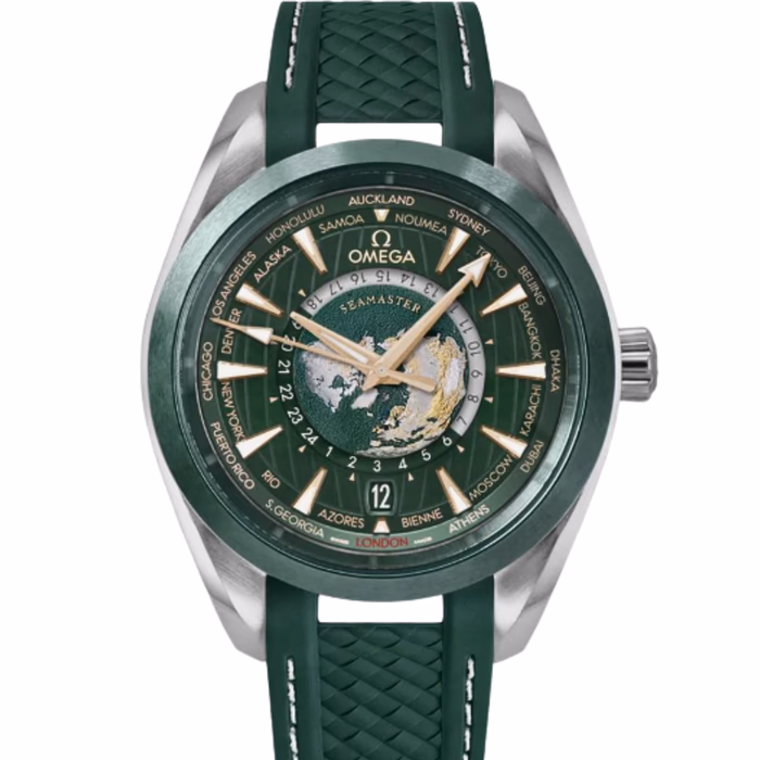 The Omega Seamaster Aqua Terra World Timer 220.32.43.22.10.001 is new for 2023. This Aqua Terra has a stainless steel case with ceramic bezel, which house a caliber 8938 - a self-winding movement with worldtimer functionality. This 43 mm Worldtimer features a stainless steel case and an integrated green rubber strap with grey stitching, an additional polished steel link and a polished and brushed foldover clasp. In the center of the green sun-brushed dial, which is framed by a bezel made of polished and brushed green ceramic, OMEGA has created a vision of the Earth as seen from the North Pole by laser-engraving the continents and colors onto a grade 5 titanium surface. Surrounding the topographical map is a 24-hour indicator, divided into day and night segments.