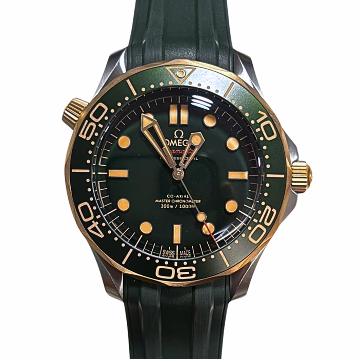 The Omega Seamaster Diver 300M 210.92.42.20.10.001, introduced in 2024, features a titanium case paired with a 'bronze gold' bezel and crowns, and an aluminium bezel inlay. The dial is Green.