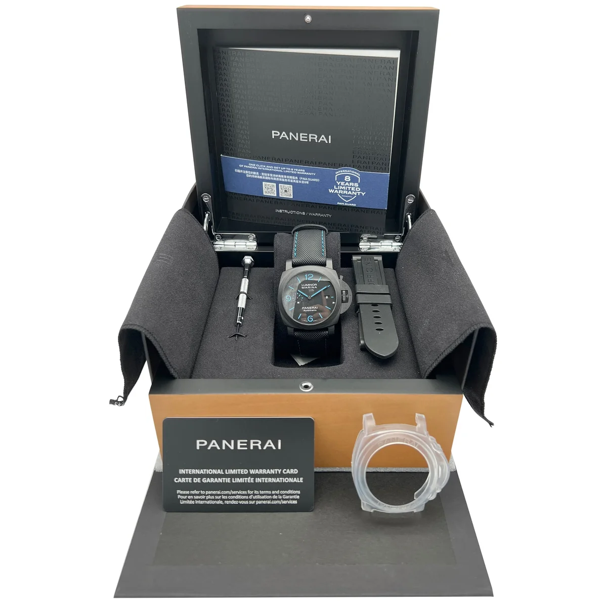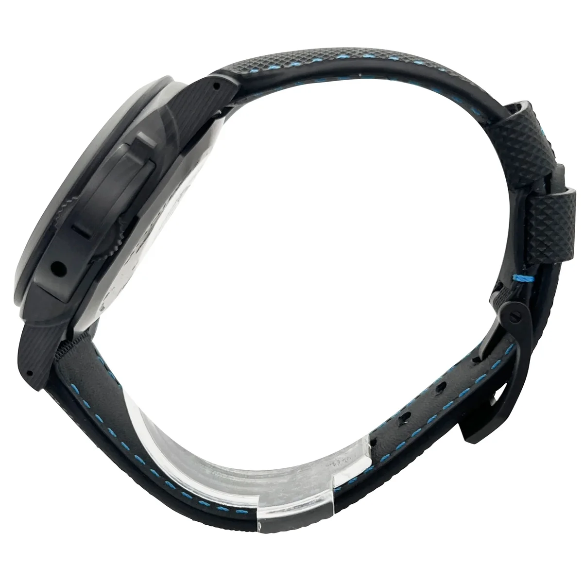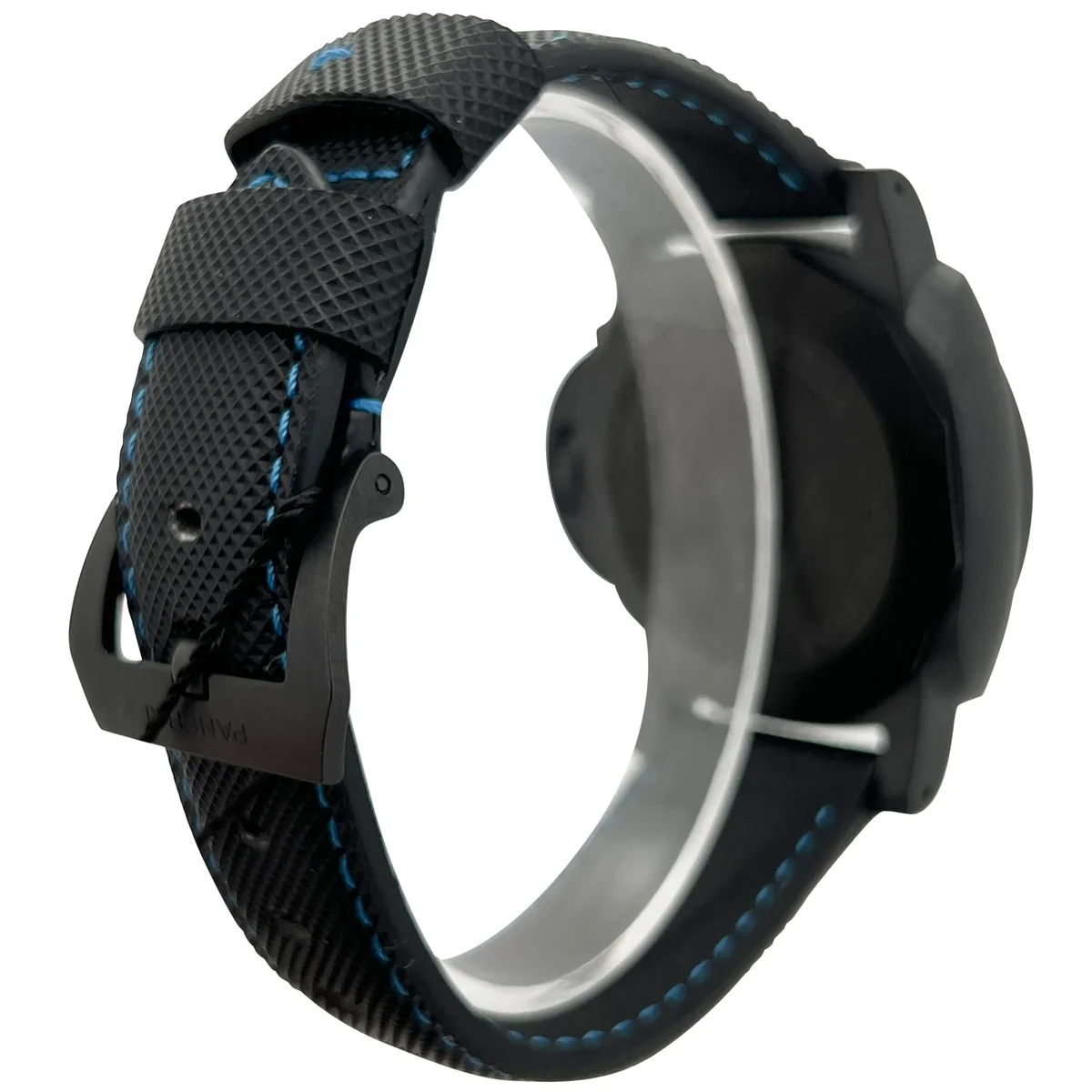 The Panerai Luminor 1950 has a 'Carbotech' case with titanium case back. Inside ticks the caliber P.9010, a self-winding movement with small seconds, date, and a 72-hour power reserve. The dial is Black.