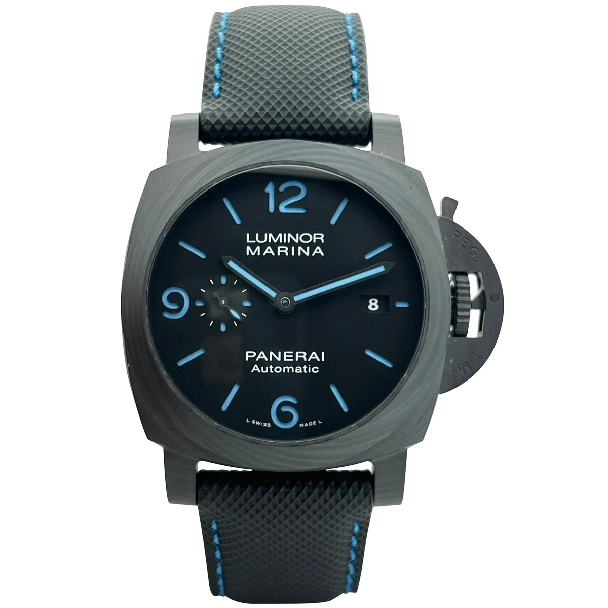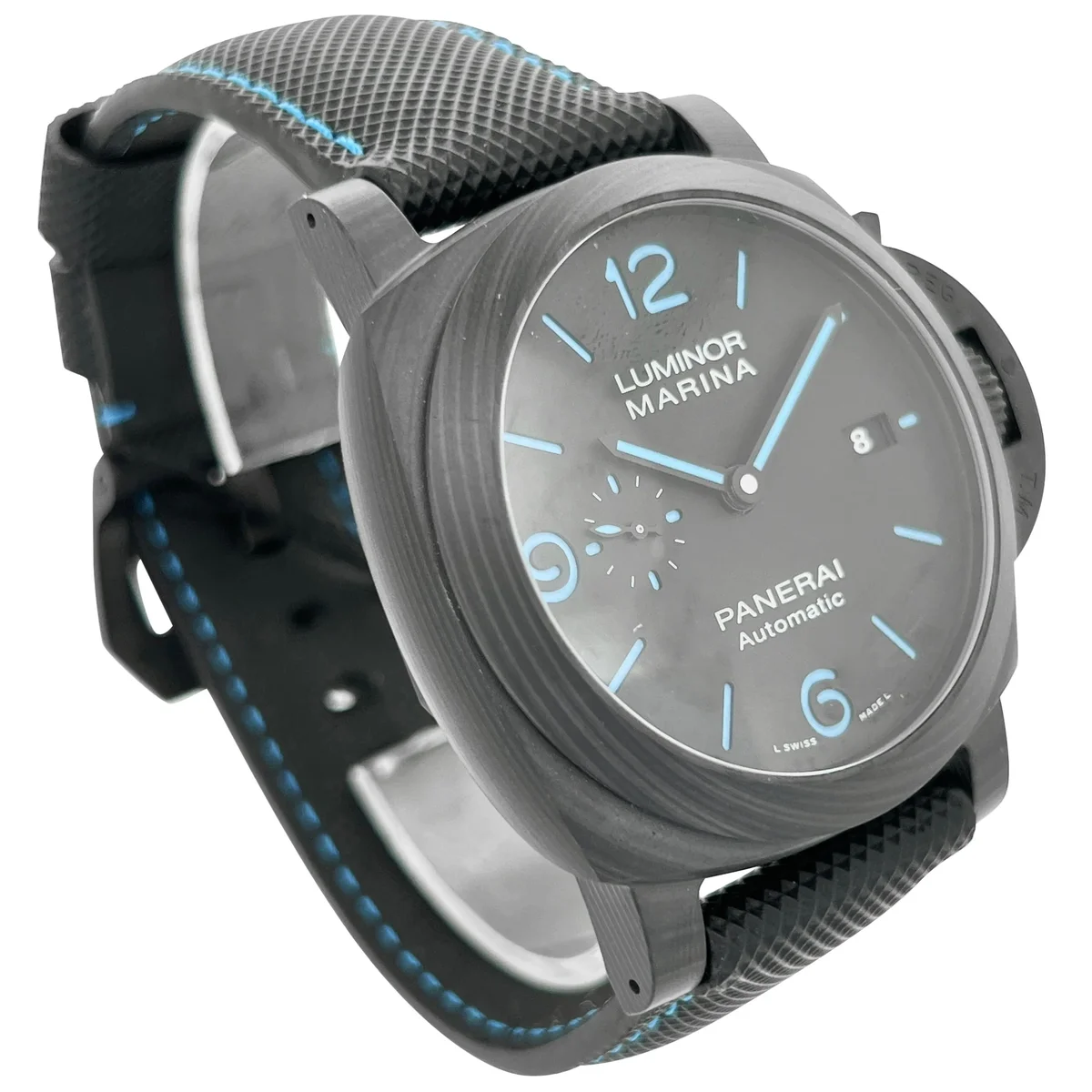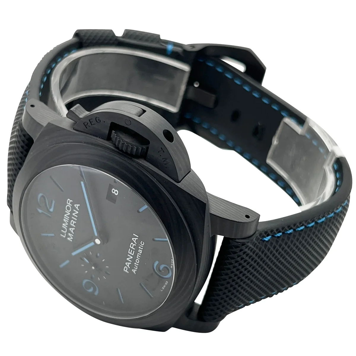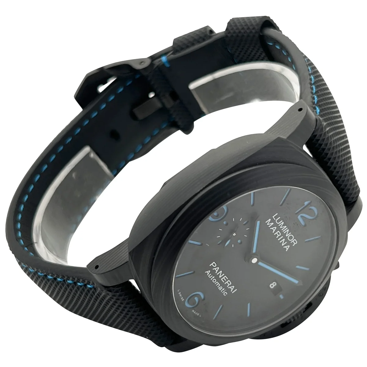 The Panerai Luminor 1950 has a 'Carbotech' case with titanium case back. Inside ticks the caliber P.9010, a self-winding movement with small seconds, date, and a 72-hour power reserve. The dial is Black.