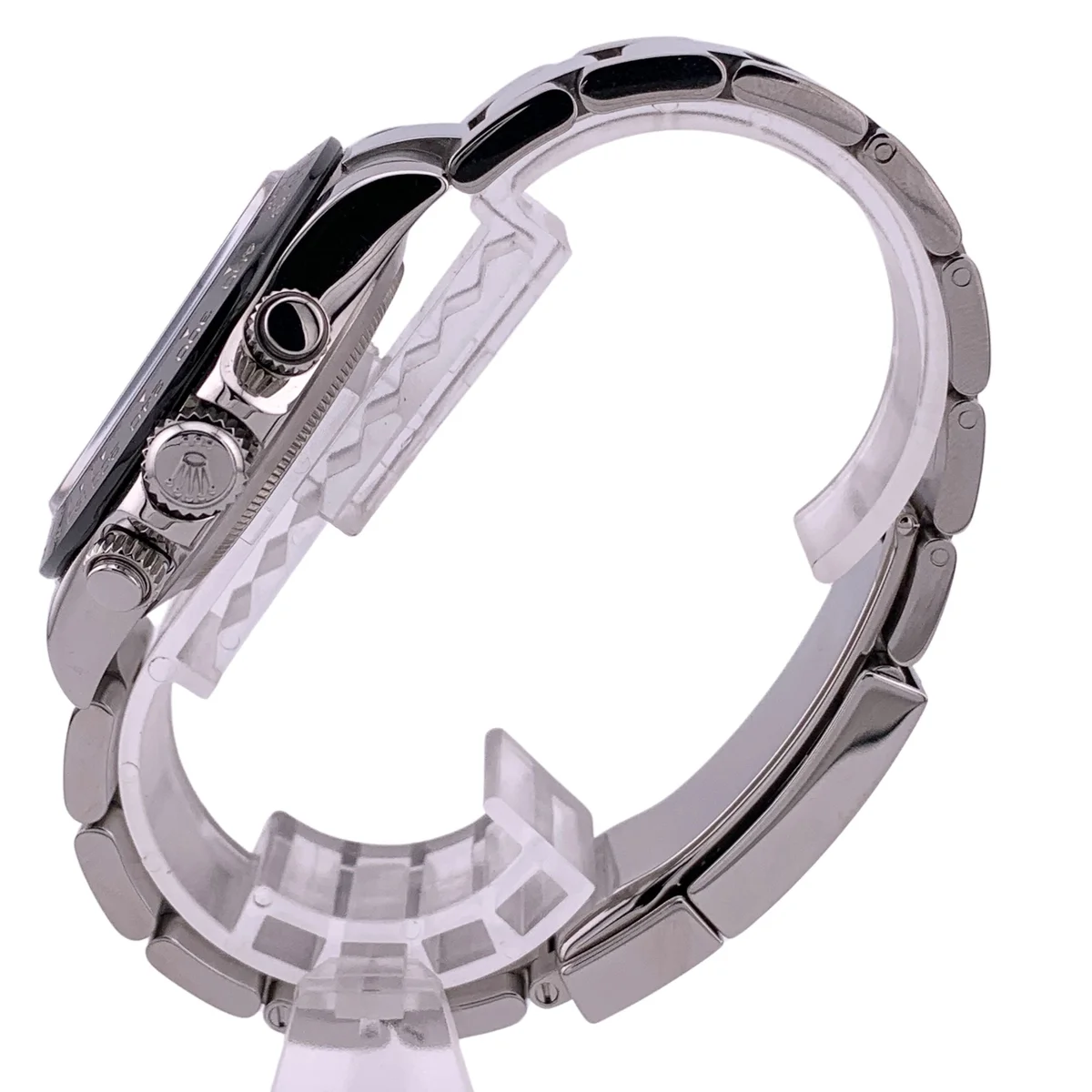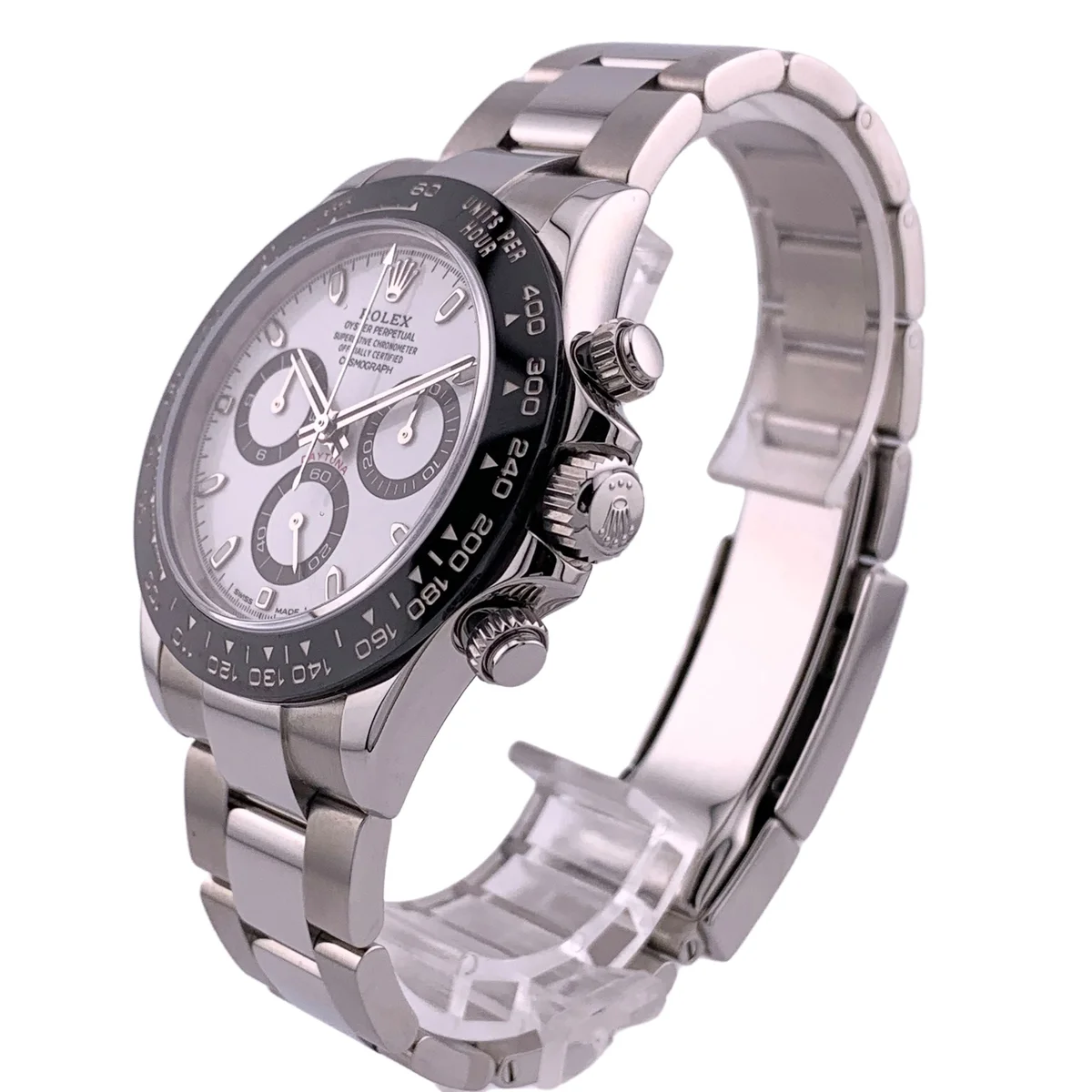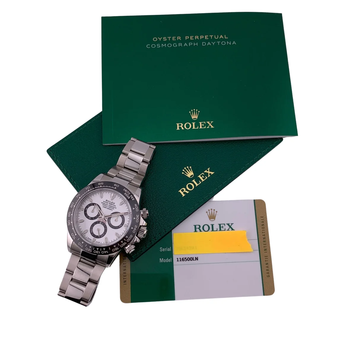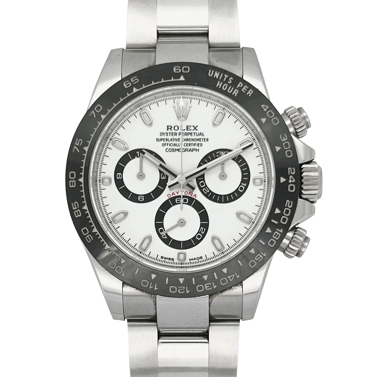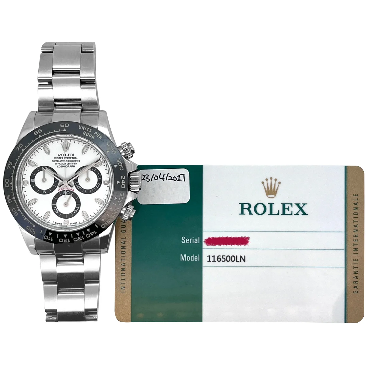 Introduced at BaselWorld 2016, the Rolex Daytona 116500ln-0001 features a stainless steel case and a black ceramic bezel and a white dial also called teh Panda Daytona. The Oyster Perpetual Cosmograph Daytona in Oystersteel with a white dial and an Oyster bracelet, features a black Cerachrom bezel with tachymetric scale.
