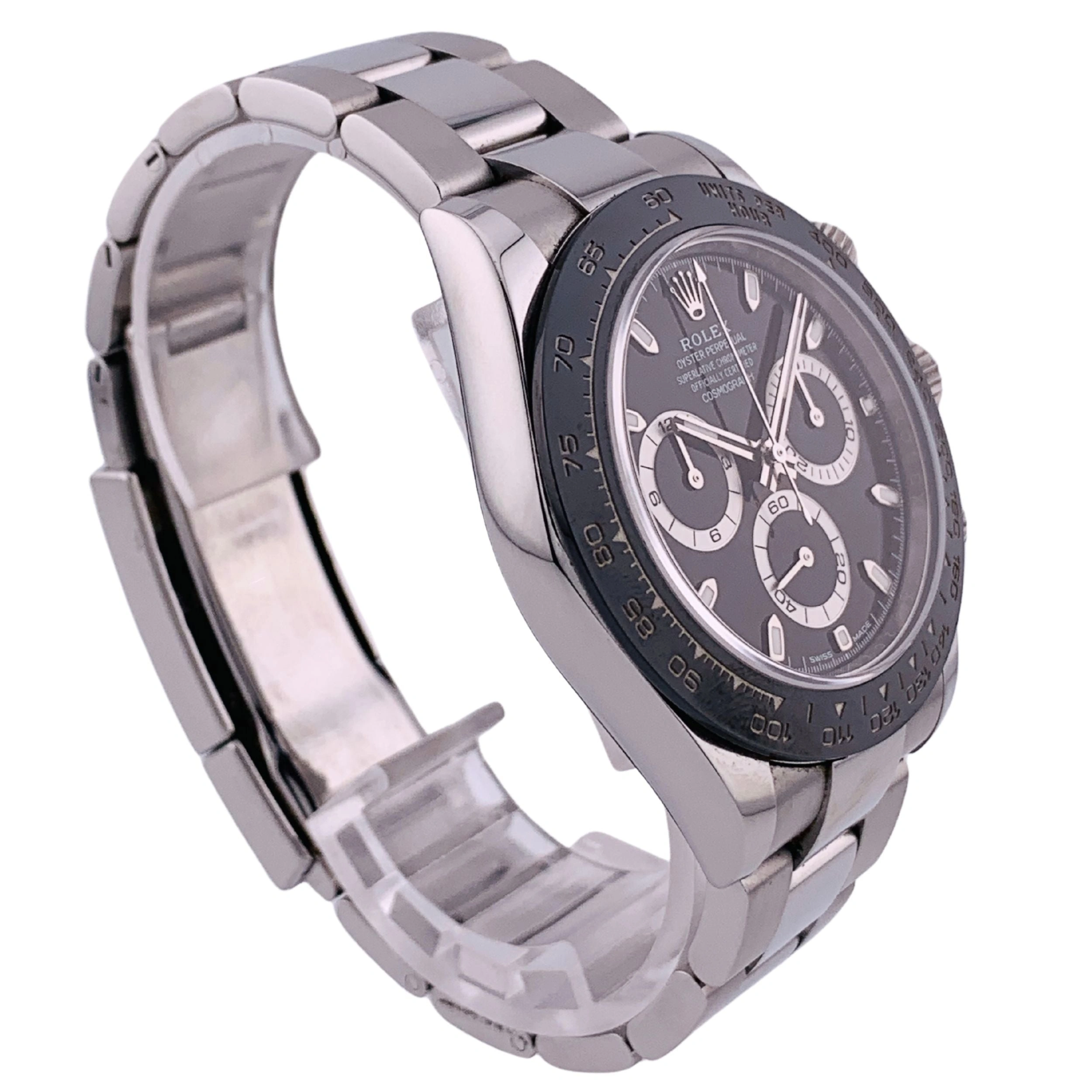 Introduced at BaselWorld 2016, the Rolex Daytona 116500ln-0001 features a stainless steel case and a black ceramic bezel. Reference 116500ln-0002 is similar though fitted with a black dial. This Oyster Perpetual Cosmograph Daytona in Oystersteel with a black dial and an Oyster bracelet, features a black Cerachrom bezel with tachymetric scale.