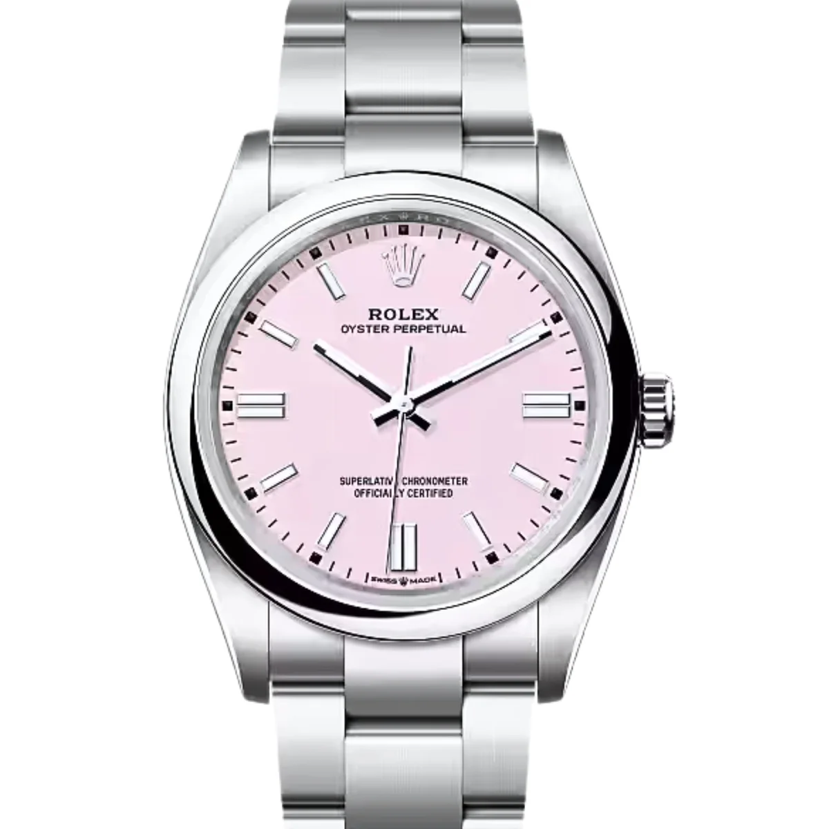 The Rolex Oyster Perpetual 36 reference 126000-0008 was introduced in 2020. This watch has a Stainless Steel case of 36.00mm, which holds the self-winding caliber 3230. The dial is Pink.