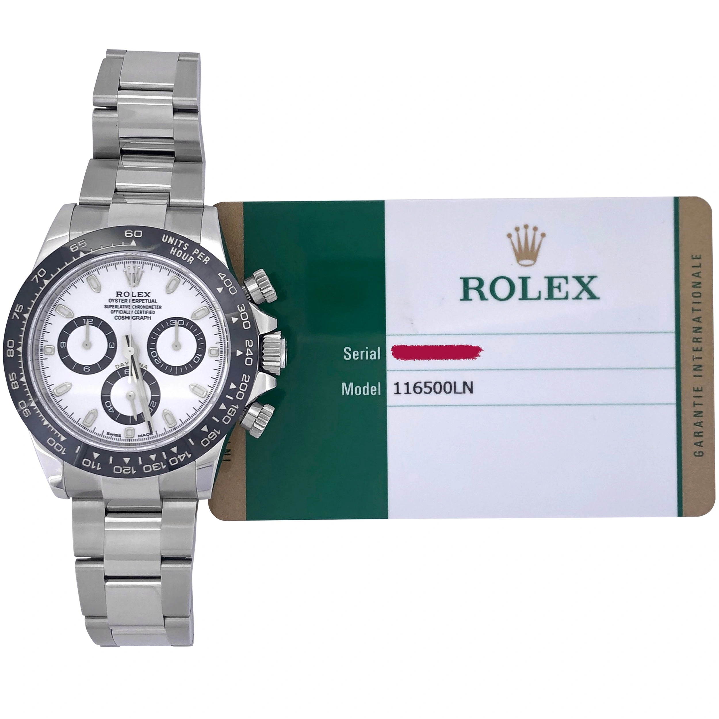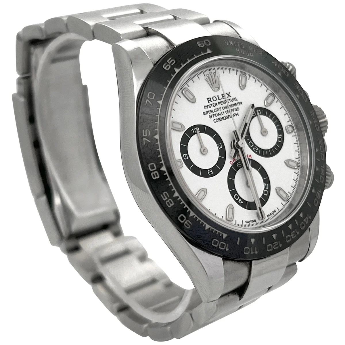 Introduced at BaselWorld 2016, the Rolex Daytona 116500ln-0001 features a stainless steel case and a black ceramic bezel and a white dial also called teh Panda Daytona. The Oyster Perpetual Cosmograph Daytona in Oystersteel with a white dial and an Oyster bracelet, features a black Cerachrom bezel with tachymetric scale.