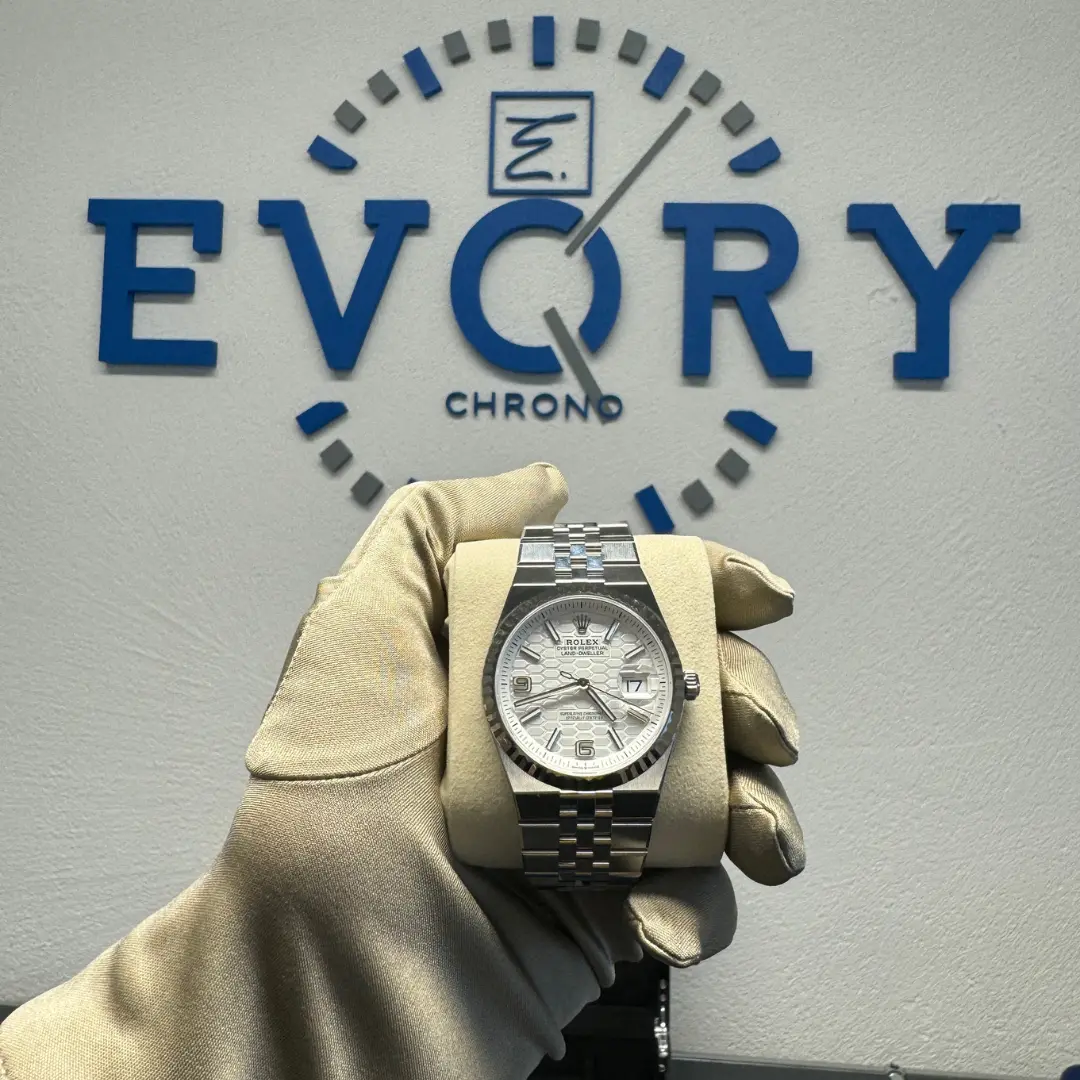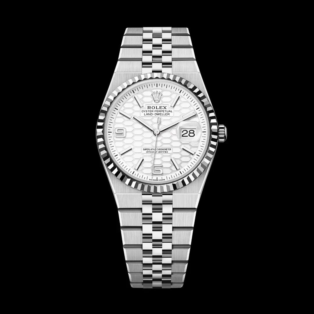 The Rolex Land-Dweller 36 127234-0001 debuted in 2025. This watch has a stainless steel case with a fluted white gold bezel, and an integrated 'Flat Jubilee' bracelet. The Land-Dweller 36 has an intense white, honeycomb-motif dial and Flat Jubilee bracelet.