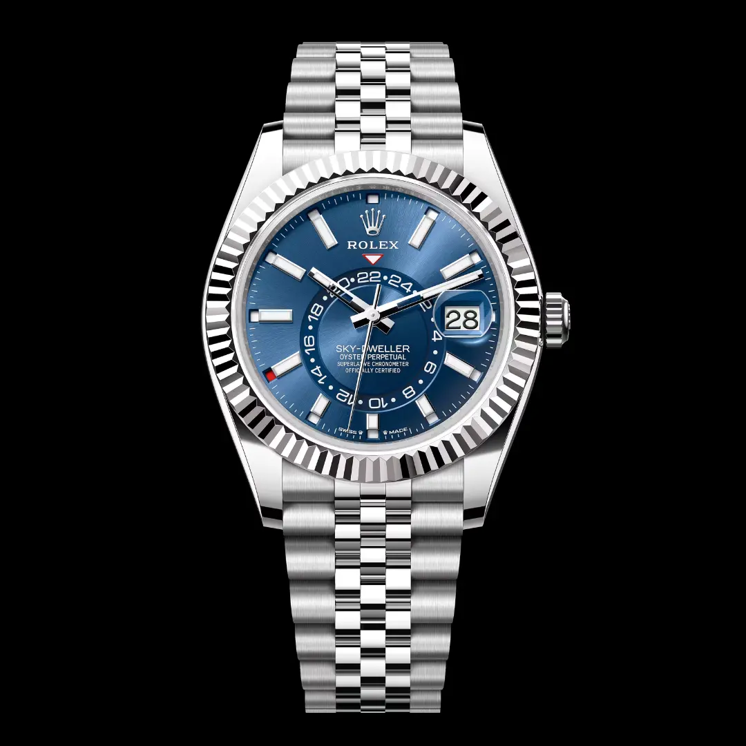 The Rolex Sky-Dweller Ref. 336934-0006 was introduced in 2023 as part of the second generation of Sky-Dweller watches, powered by the updated caliber 9002. This watch has a stainless steel case with white gold bezel, and a Blue dial.