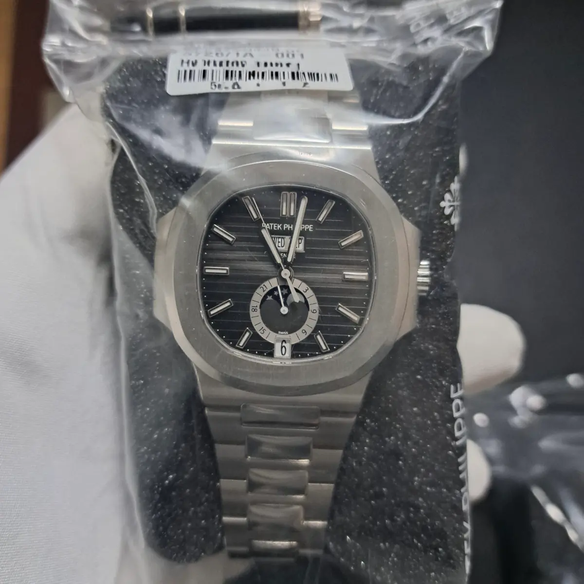 The Nautilus 5726 is a more complicated member of Patek Philippe's iconic sports watch. It features an annual calendar automatic movement with moonphase display and a case that's slightly larger compared to the 5711. The present 5726/1A-001 has a stainless steel case and bracelet and a black dial.
