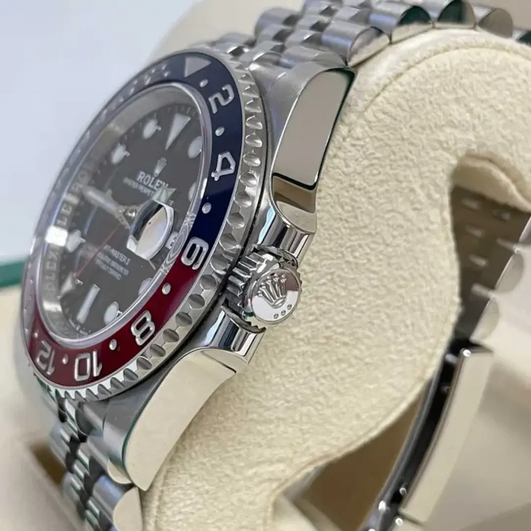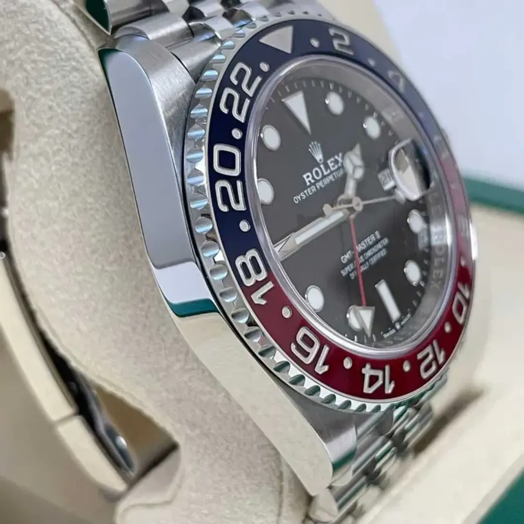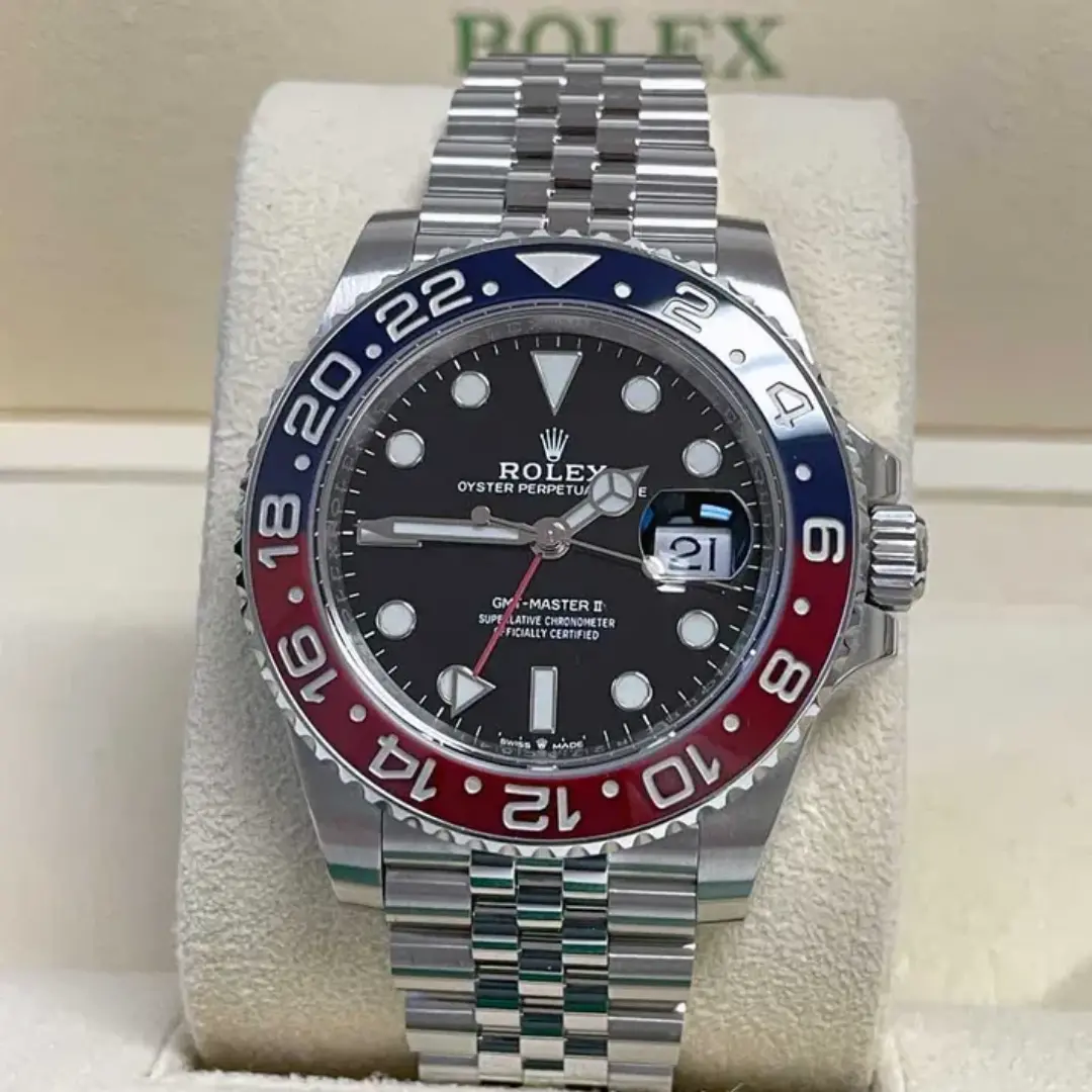 The Rolex GMT-Master 126710 was introduced at BaselWorld 2018. It features a Pepsi bezel insert in ceramic, a jubilee bracelet, and the new caliber 3285. Functions: Centre hour, minute and seconds hands. 24-hour display. Second time zone with independent rapid-setting of the hour hand. Instantaneous date. Stop-seconds for precise time setting. Bezel: Bidirectional rotatable 24-hour graduated bezel. Two-colour red and blue Cerachrom insert in ceramic, moulded numerals and graduations, Clasp: Folding Oysterlock safety clasp with Easylink 5 mm comfort extension link
