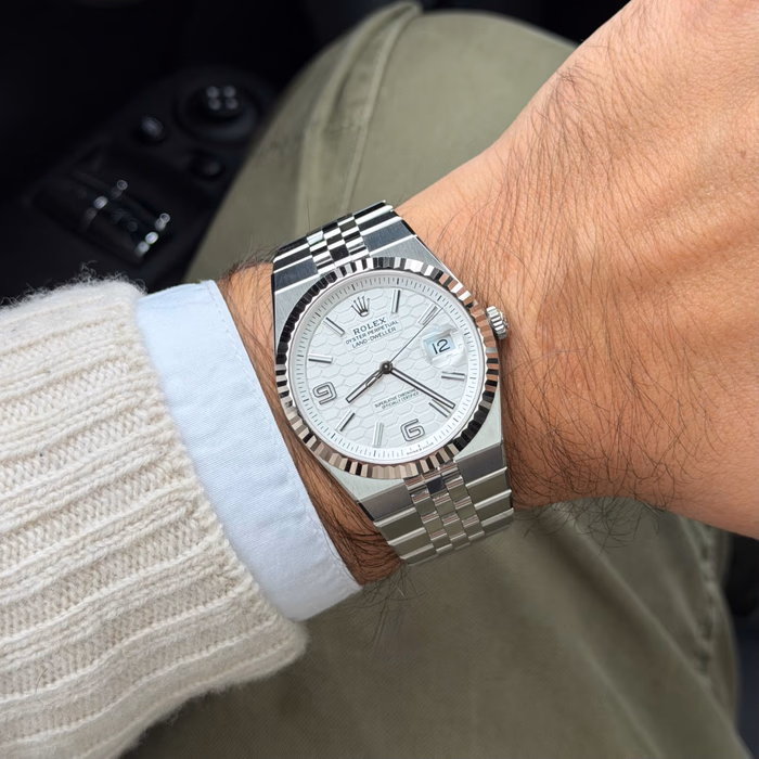 The Rolex Land-Dweller 36 Ref. 127334-0001 debuted in 2025 and has a 40 mm case size. This watch has a stainless steel case with a fluted white gold bezel, and an integrated 'Flat Jubilee' bracelet. The Land-Dweller 40 has an intense white, honeycomb-motif dial and Flat Jubilee bracelet.