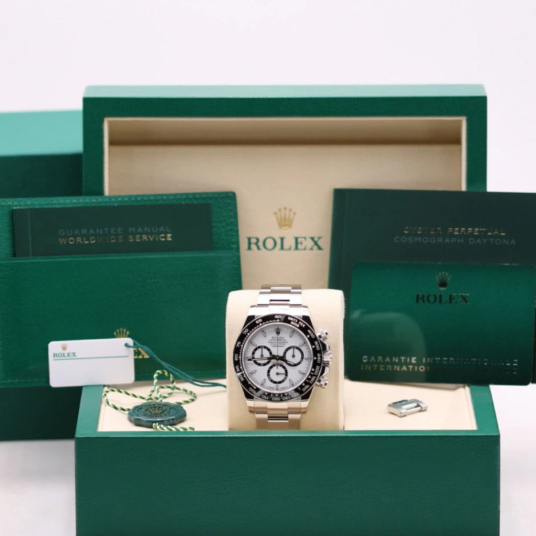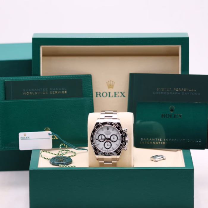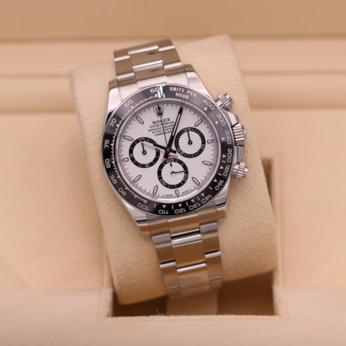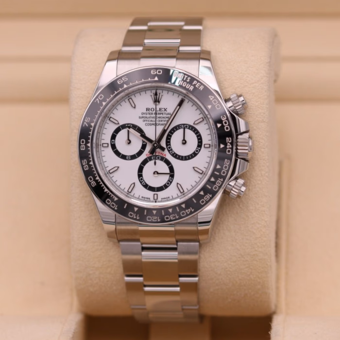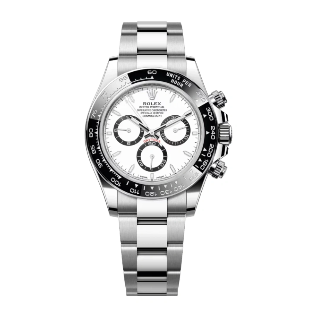 The Rolex Cosmograph Daytona 126500LN-0001 also nicknamed the Panda Daytona was introduced in 2023. This Daytona has a stainless steel case crowned by a black Cerachrom bezel with engraved tachymeter scale. This watch is powered by the updated caliber 4131. This Daytona is fitted with an Oyster bracelet.