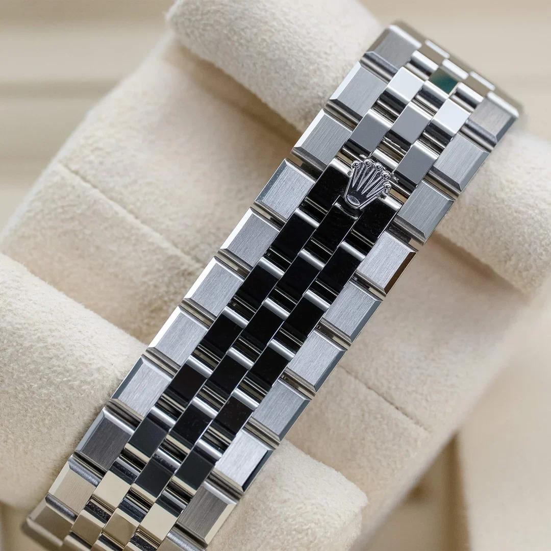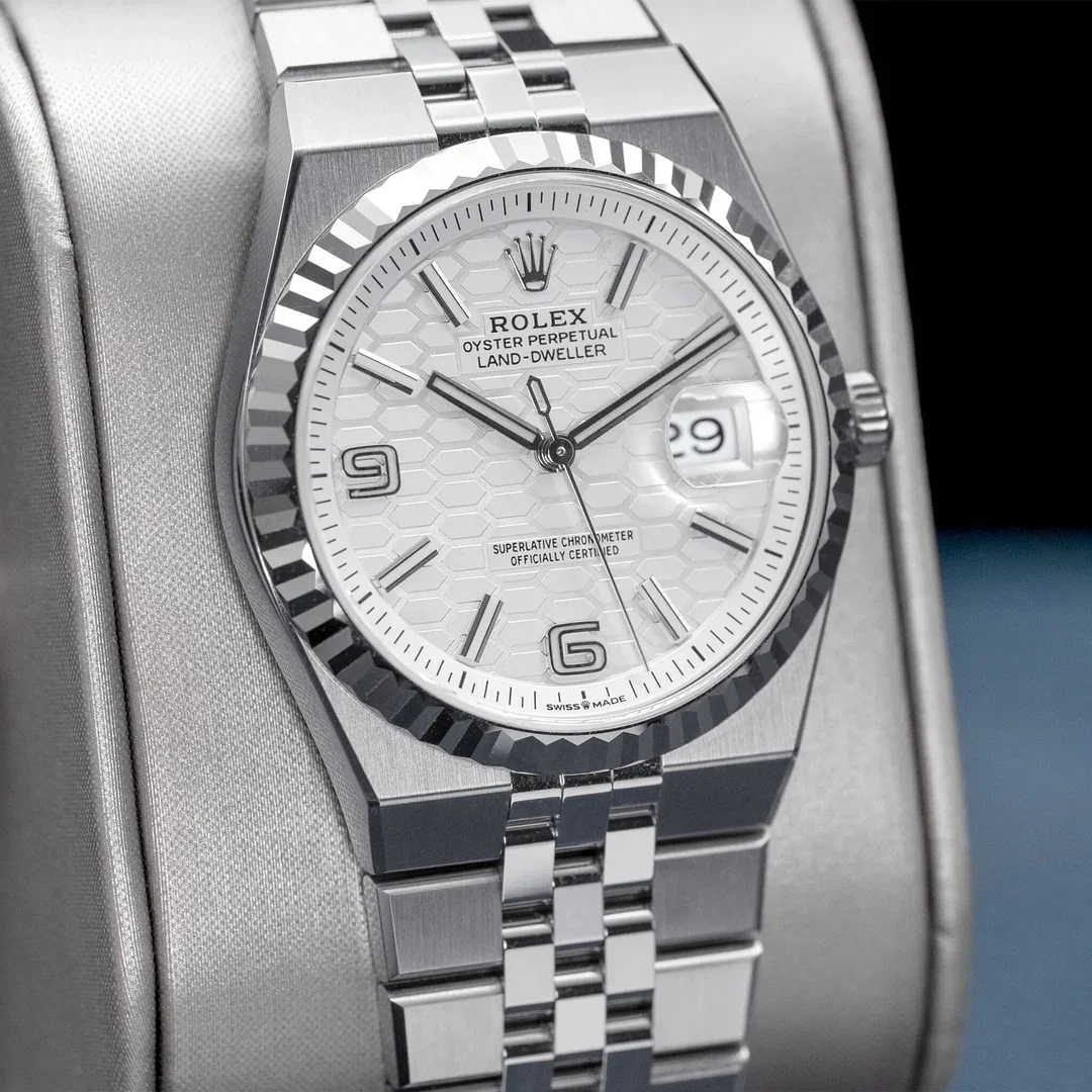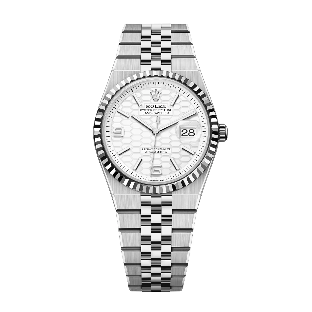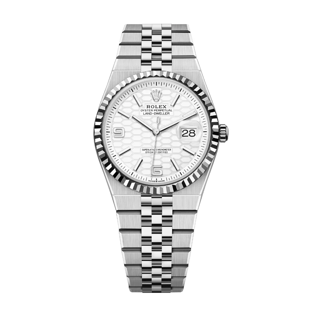 The Rolex Land-Dweller 36 127234-0001 debuted in 2025. This watch has a stainless steel case with a fluted white gold bezel, and an integrated 'Flat Jubilee' bracelet. The Land-Dweller 36 has an intense white, honeycomb-motif dial and Flat Jubilee bracelet.