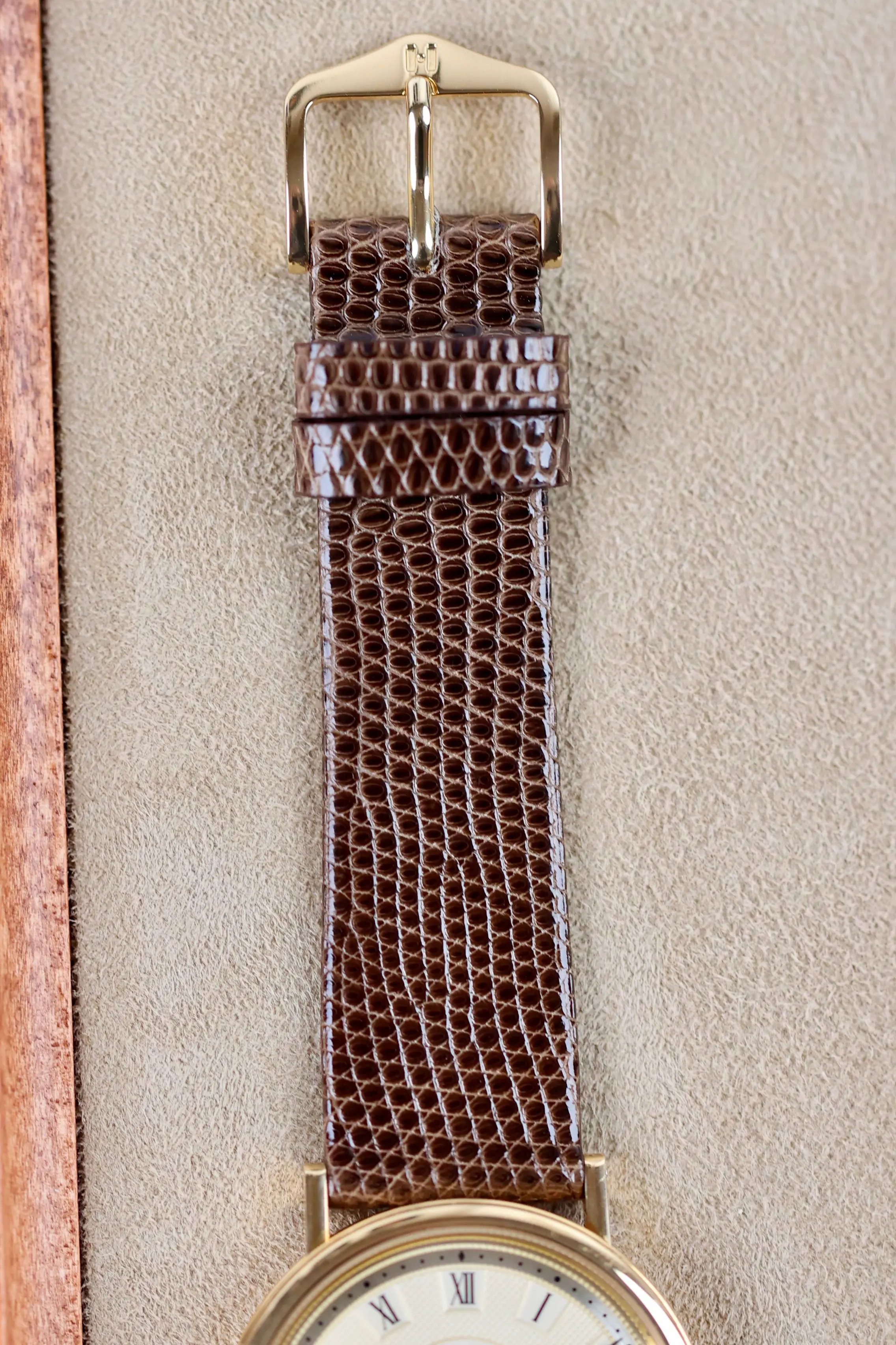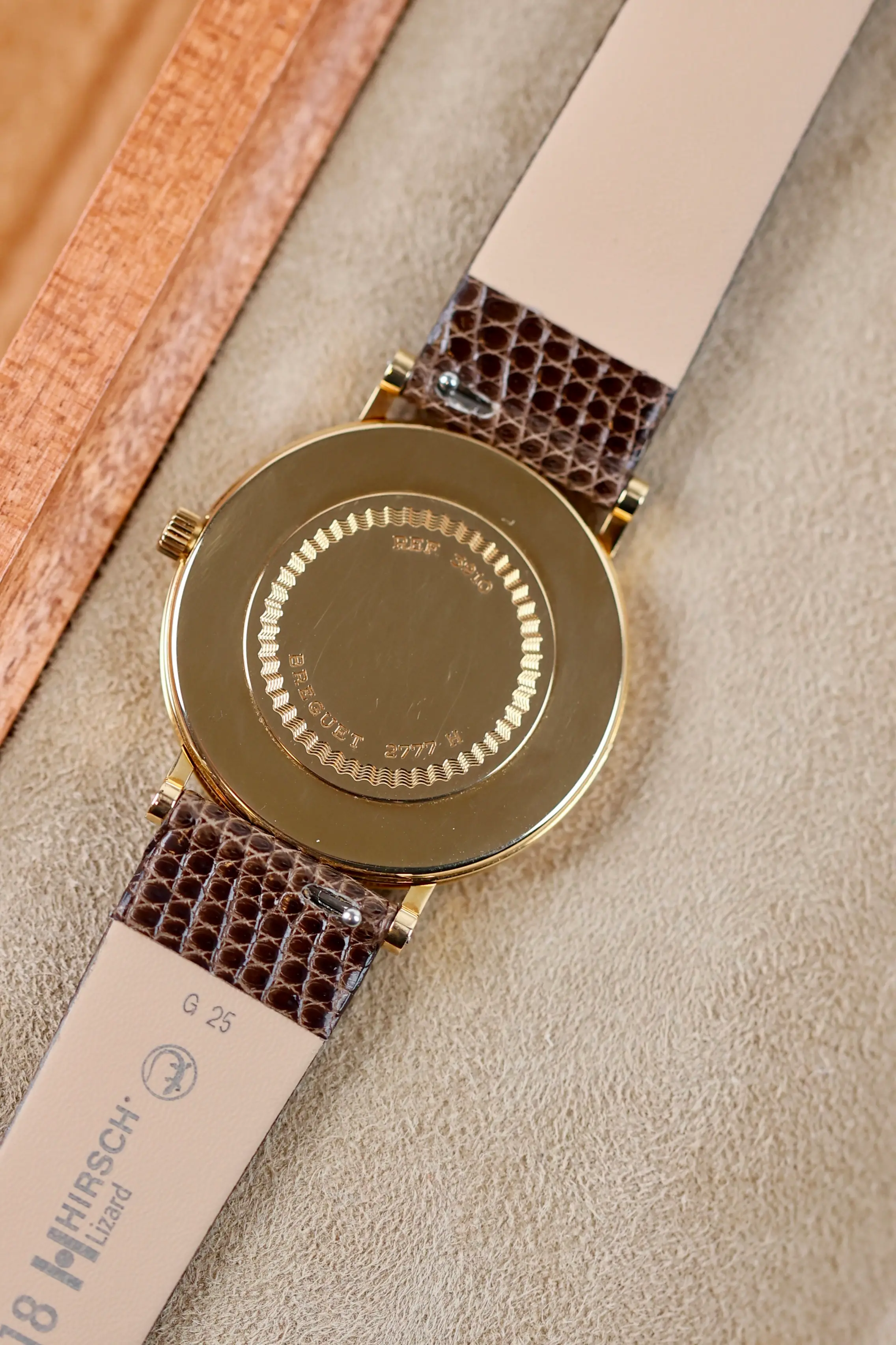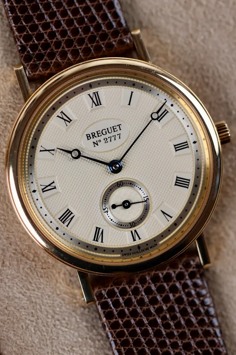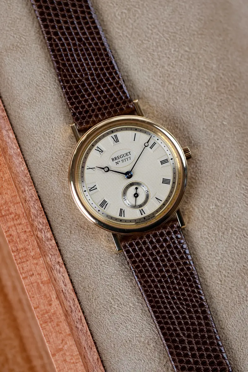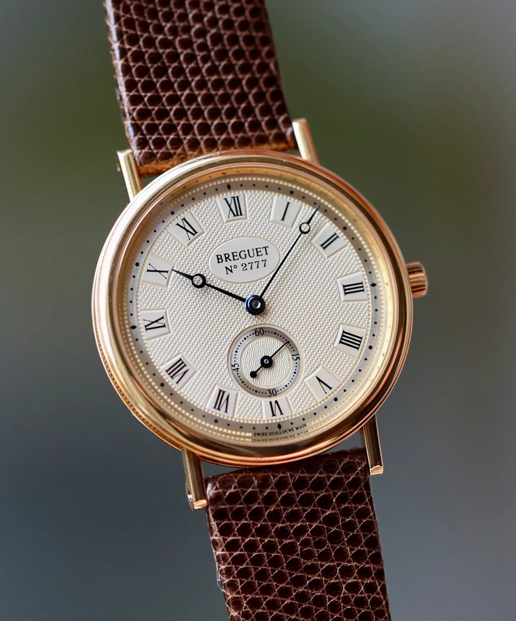 Breguet Classy Ref. 3910 with a 34 mm case size in 18k yellow gold. This is the quiet classic, a hand‑wound, small‑seconds dress watch from the house that practically invented haute horlogerie. With a svelte case, timeless Roman‑style or clean dial, and that signature coin‑edge bezel.