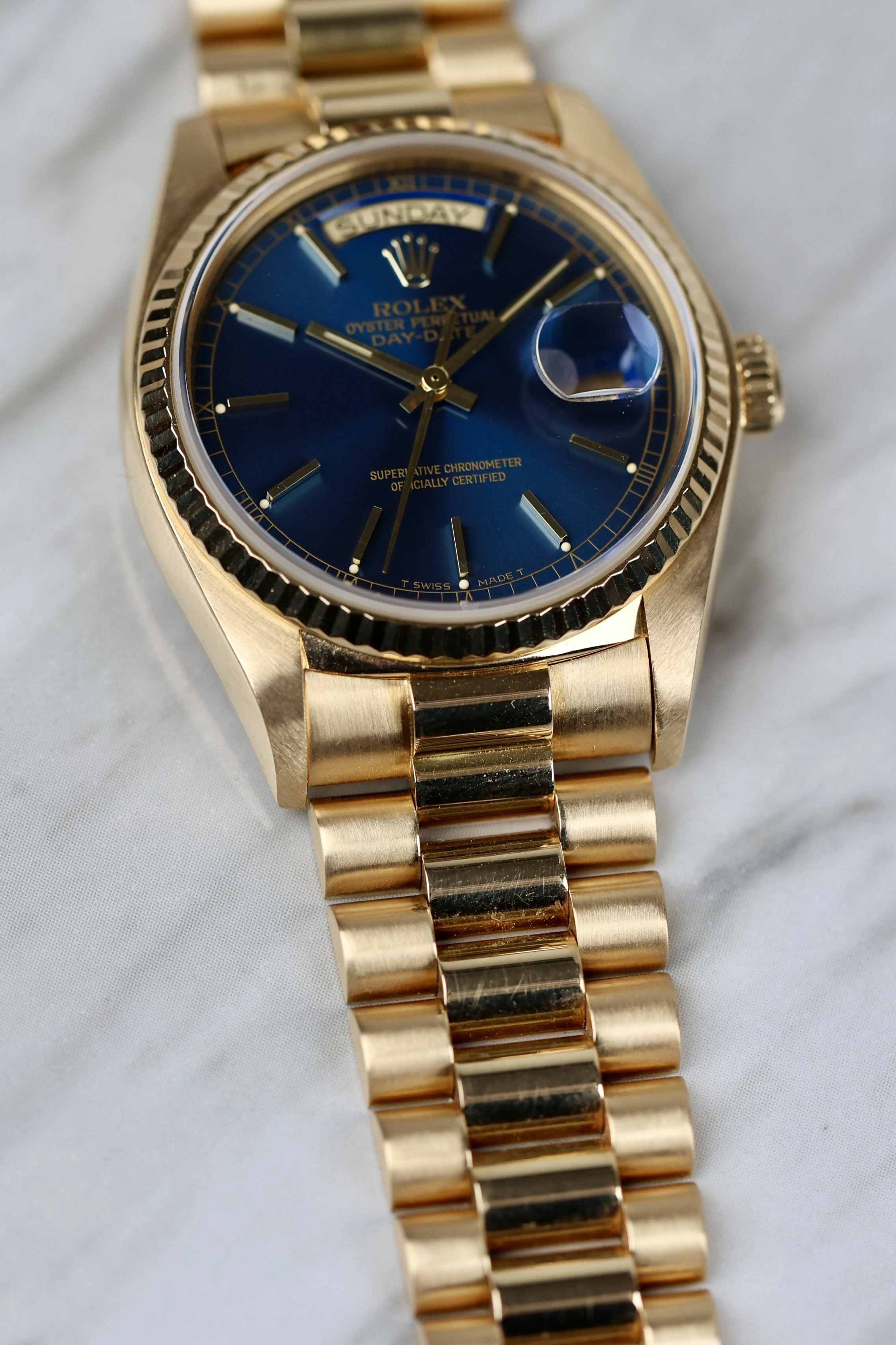 The Rolex Day-Date 18038 was the first DD to be equipped with sapphire glass. It's movement now had a quick-set function for the date; it is generally referred to as the 'single quick'. The example posted has a yellow gold body and bracelet plus a dial that comes in various color variations. Launched in 1956, the Day-Date was the first watch to display both the day and date through an aperture in the dial. Rolex has never shied away from being associated with influential figures, including a number of presidents, which is how this model earned its nickname. With a diameter of 36mm, the reference 18038 was produced between 1977 and 1989.