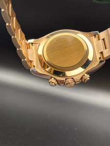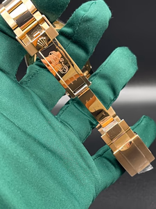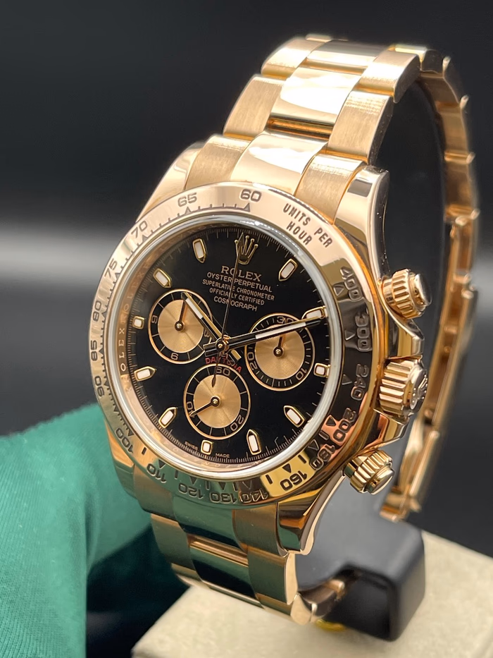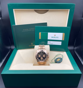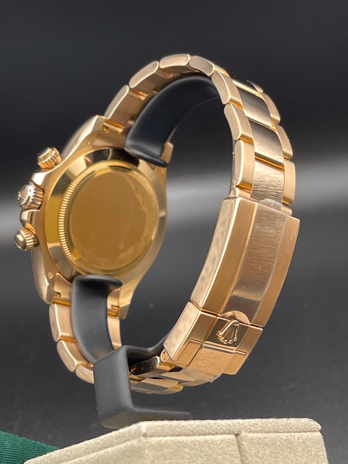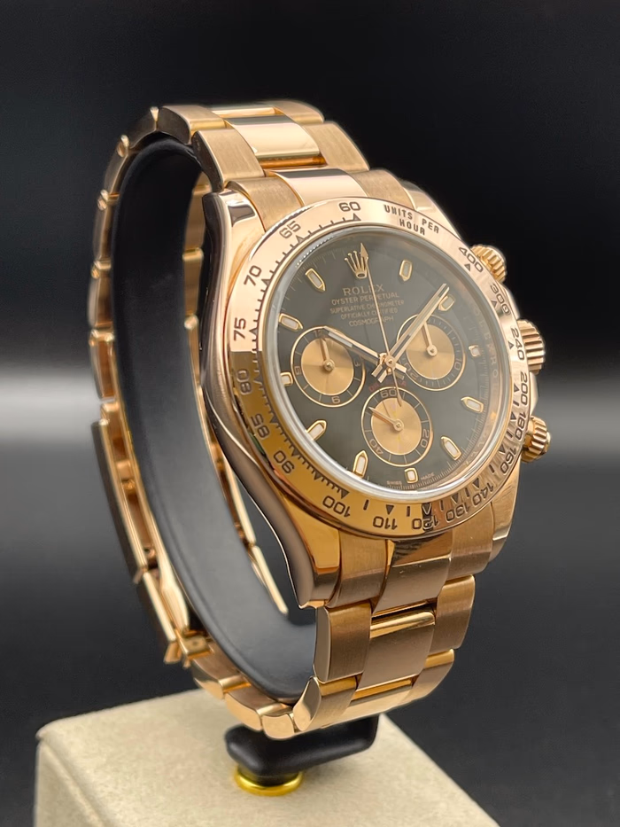 With its state-of-the-art technology, evocative heritage and sporting aura, the Oyster Perpetual Cosmograph Daytona swiftly became an iconic watch. Its dial carries in red letters the name “Daytona” – the most famous motor racing circuit in the United States. Available in 904 L steel, 18 ct gold and Rolesor versions with a variety of dials, robust Oyster bracelets as well as elegant leather straps both equipped with high security Oysterlock clasps, the Cosmograph Daytona is tailored for the track and the concert hall. The present examples pairs a rose gold case and bracelet with a black dial.