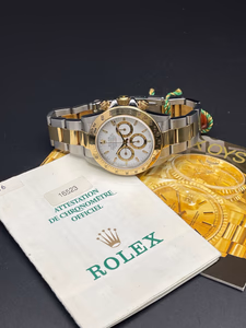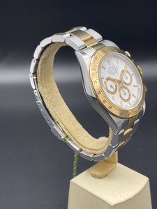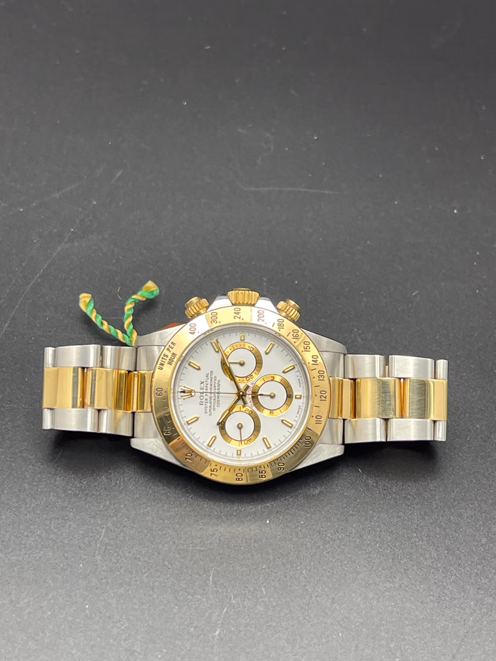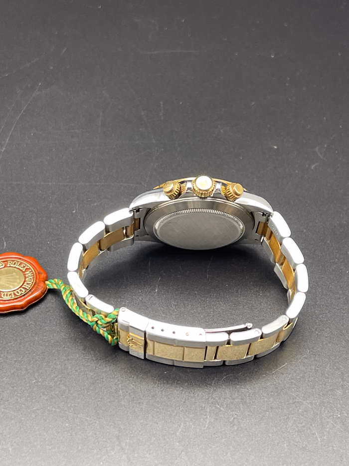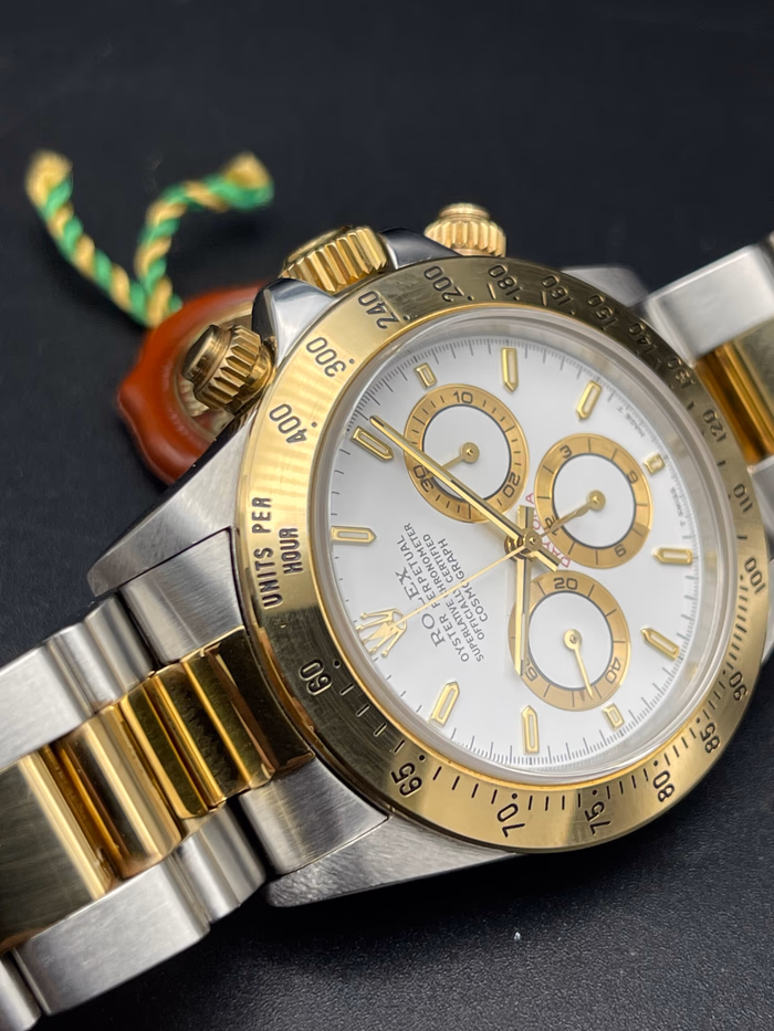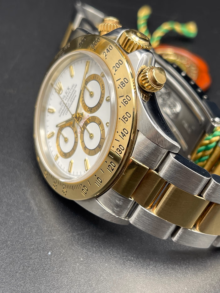 Rolex Cosmograph Daytona ref 16523 in yellow gold and stainless steel. Officially certified, self-winding chronometer with a chronograph "El Primero" movement Caliber 4030. Before Rolex brought production of the Daytona movement in-house, the Big Crown outsourced it from Zenith and the company's celebrated "El Primero" mechanical movement. Today, all Rolex chronograph movements are developed and produced entirely in-house, making this discontinued Rolex ref. 16523 something of a cult-favorite among collectors in the know.