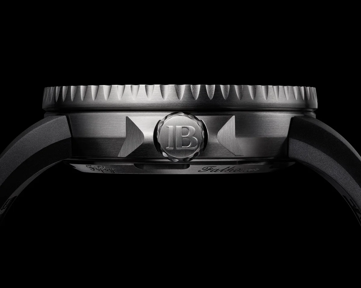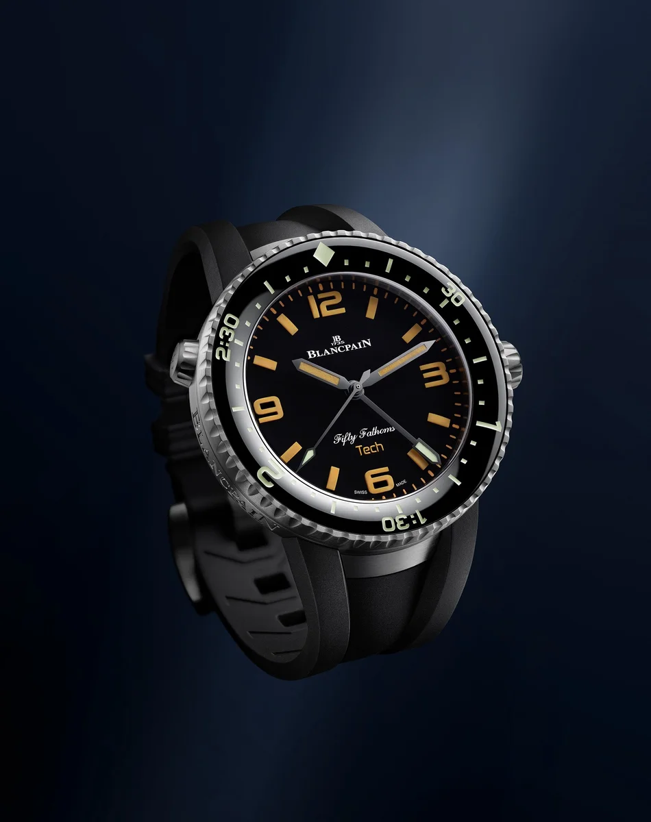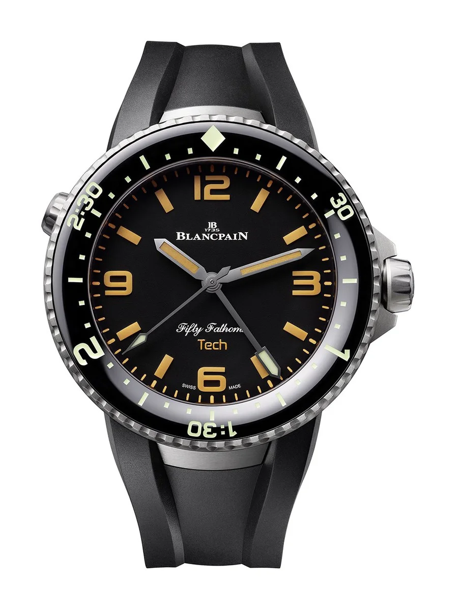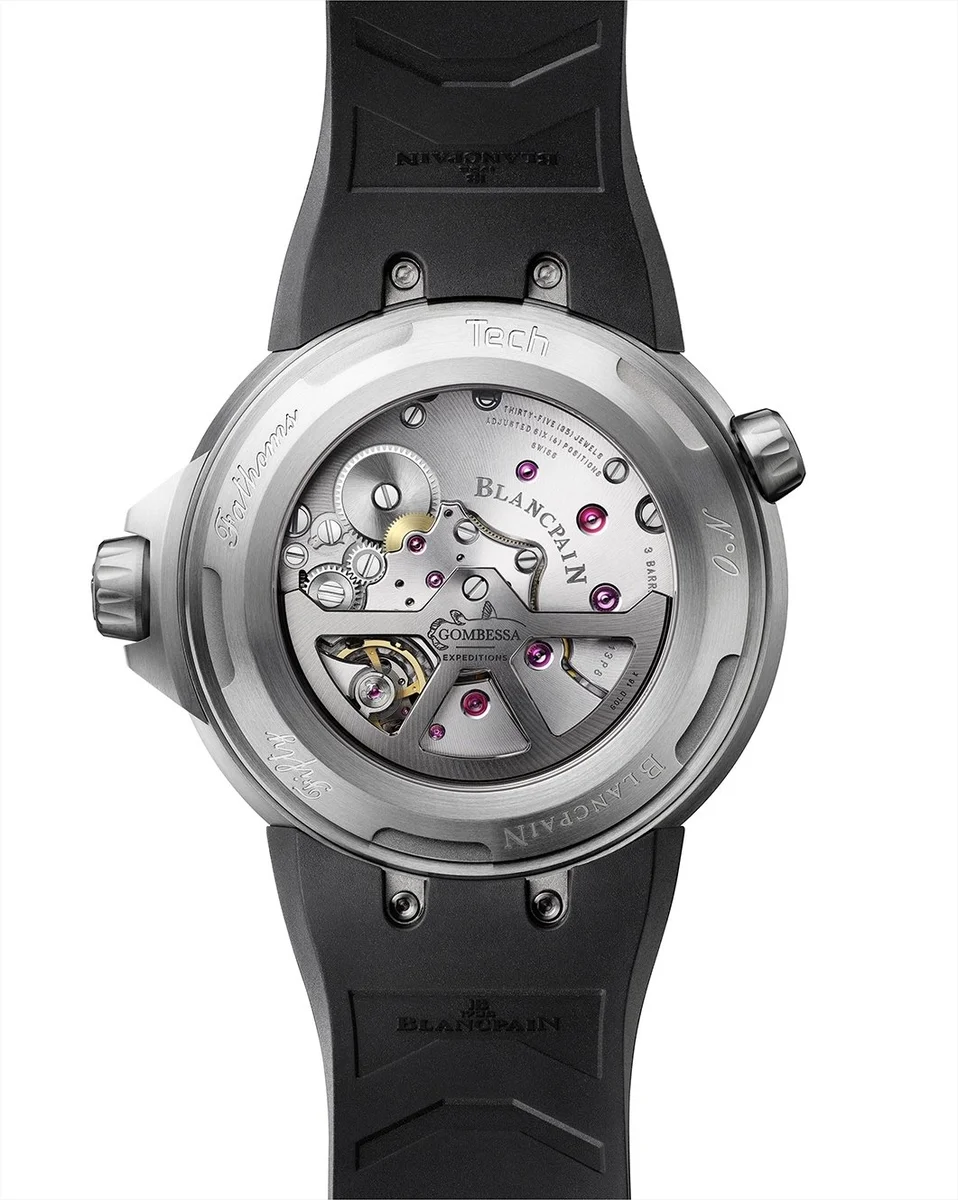 Blancpain Fifty Fathoms Tech Gombessa ref 5019 12B30 64A 70th Anniversary Act 2. Decompression valve, Unidirectional bezel, Dial color: Black dial , Case material: Titanium, Water resistance: 30 bar , Diameter: 47 mm , Case height: 14.81 mm , Sapphire Back: Yes , Strap type: Rubber , Strap material: Rubber