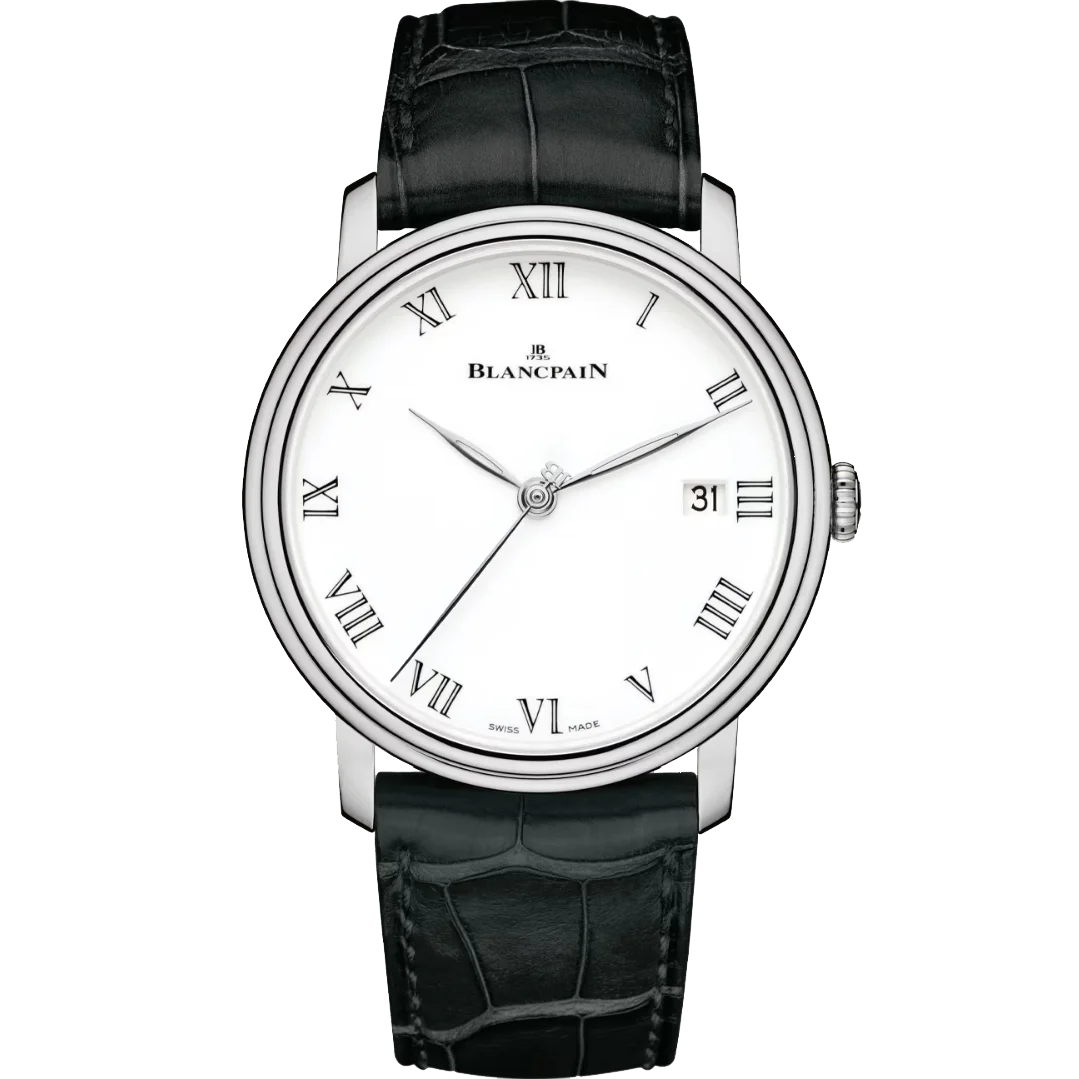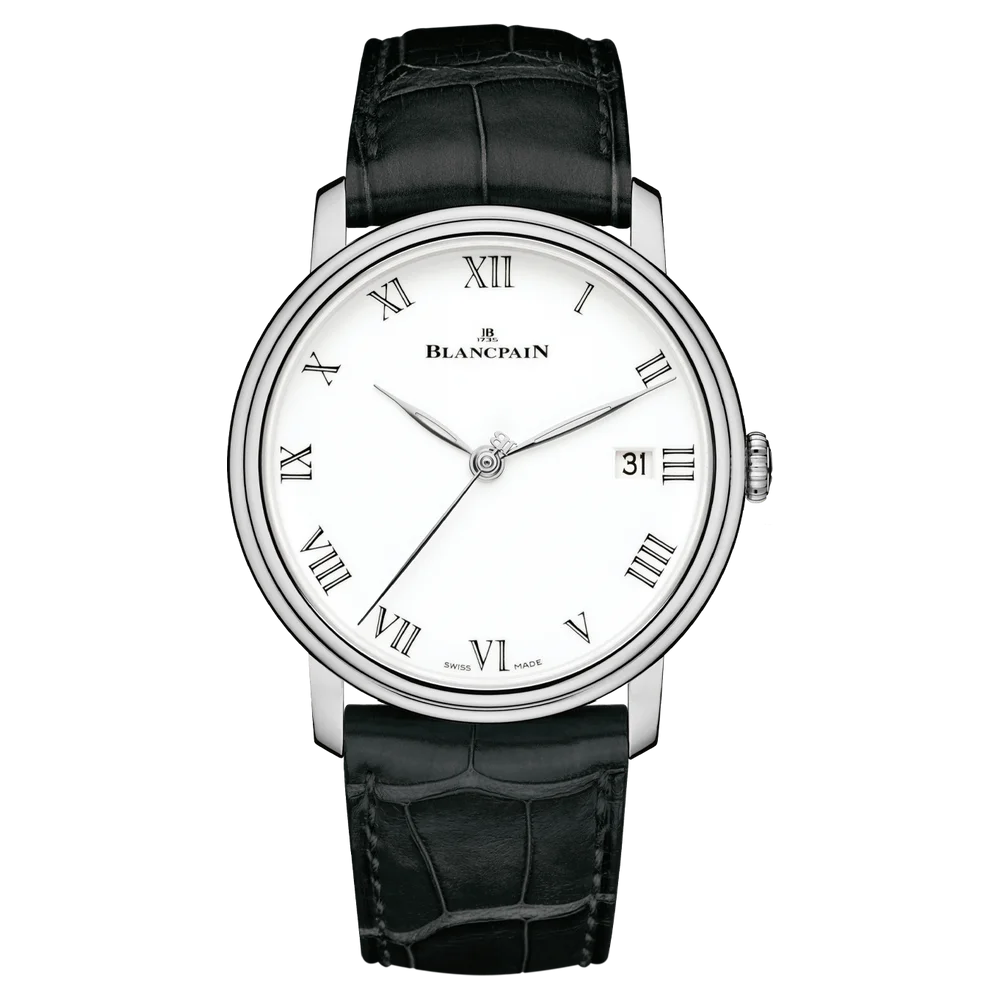 The Blancpain Villeret 8 Jours Ref. 6630 1531 55B is a gentleman's wristwatch powered by caliber 1335, which provides it with a power reserve of 8 days. The case, in the stepped Villeret-style, measures 42mm across. Reference 6630-1531-55B has a case in white gold, paired with a white dial in grand feu enamel.