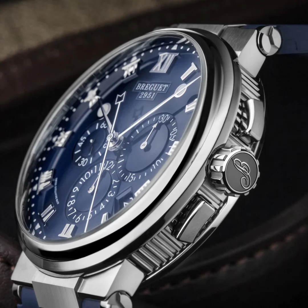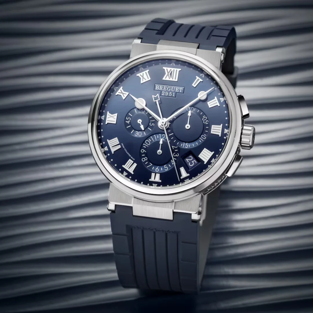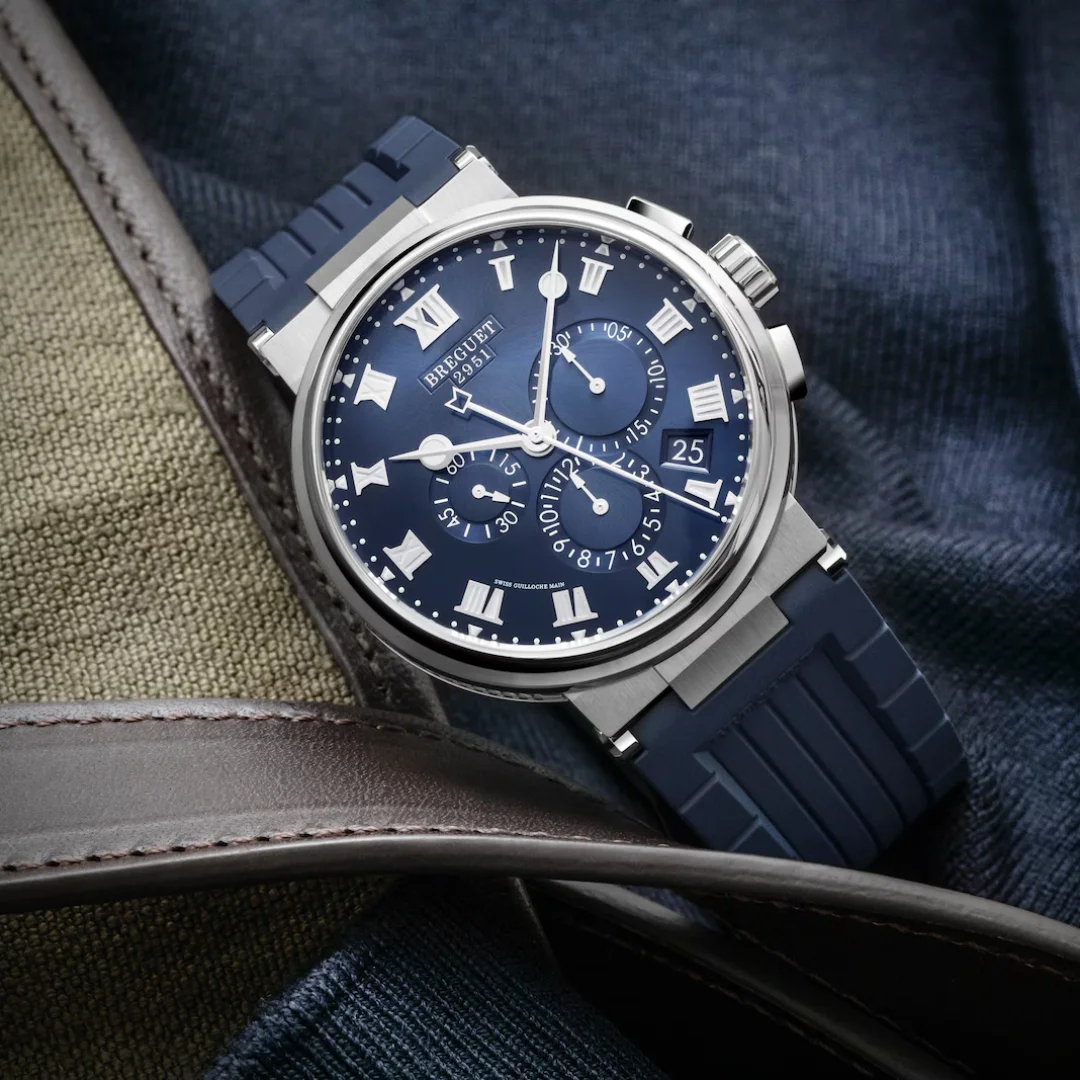 Breguet introduced an updated Marine collection at BaselWorld 2018, building on the look that was introduced with the 2017 Marine Équation Marchante 5887. Among them the Marine Chronograph, which features 42.3mm case housing a self-winding movement with chronograph and date. Reference 5527TI/Y1/5WV has a Titanium case and a Blue dial. This version was added to the collection in 2021.