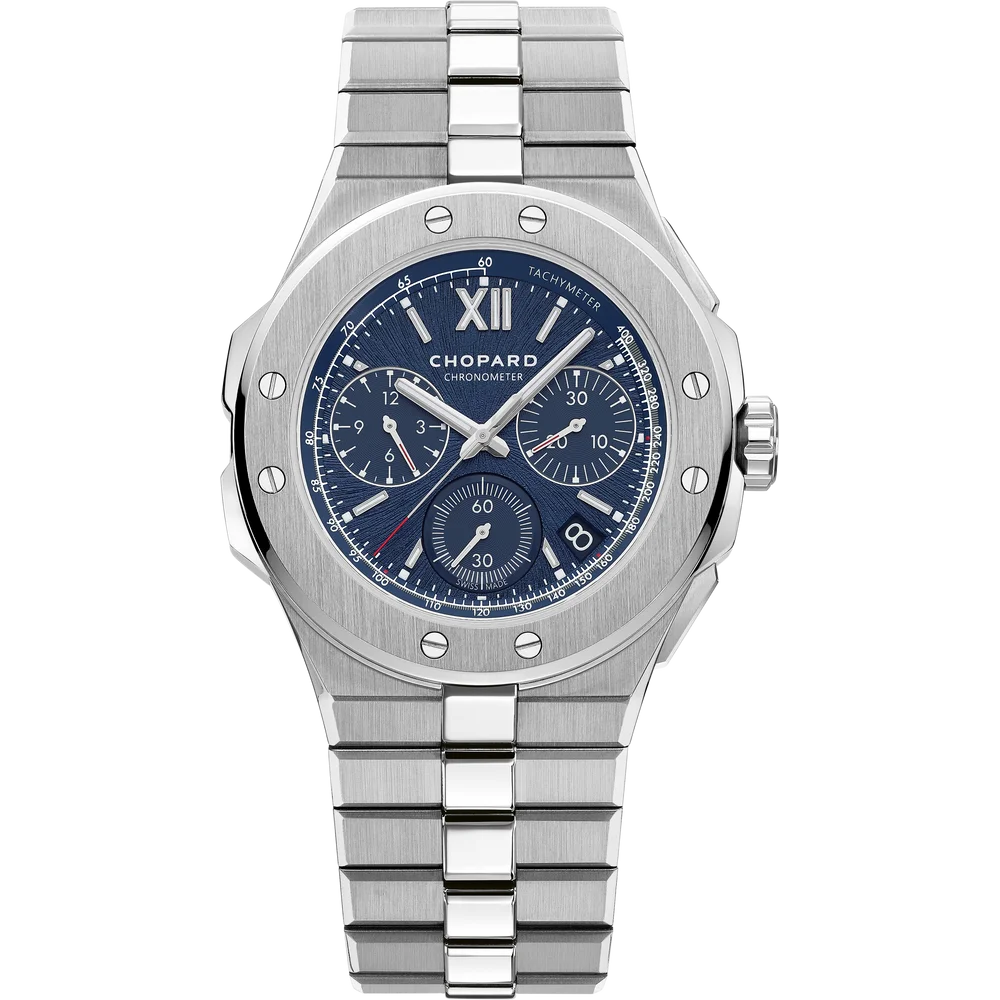 Chopard Alpine Eagle Chronograph Ref. 298609-3001. Both elegant and sport-inspired, the new Alpine Eagle XL Chrono is a modern interpretation of the St. Moritz launched in 1980, the first watch designed by Karl-Friedrich Scheufele, today co-president of Chopard. Expressing its creator's passion for the Alps and inspired by the nobility of the eagle, this timepiece is crafted in Lucent Steel™, and it features a chronometer-certified integrated chronograph movement with a flyback feature. Alpine Eagle pays tribute to today's eagles – those ambitious people who surpass themselves on a daily basis, and whose vision is an inspiration for their peers.