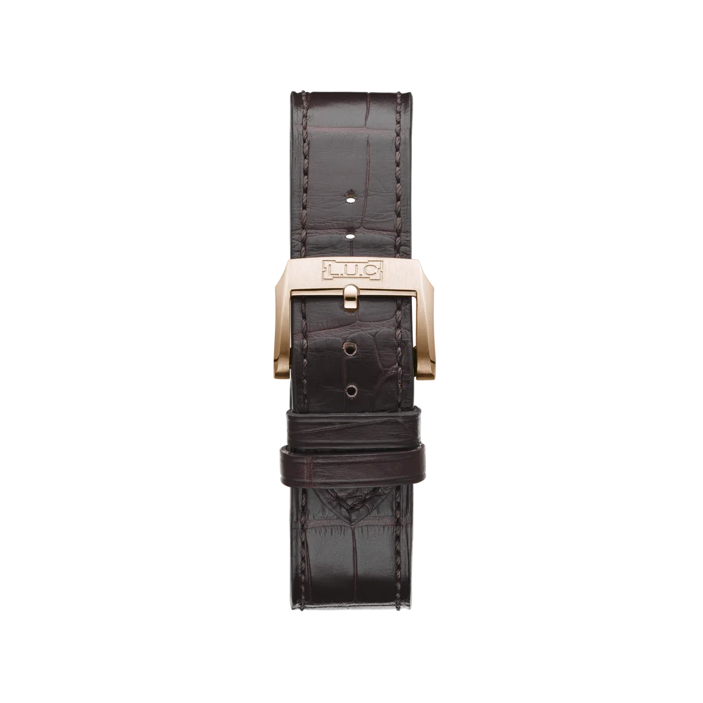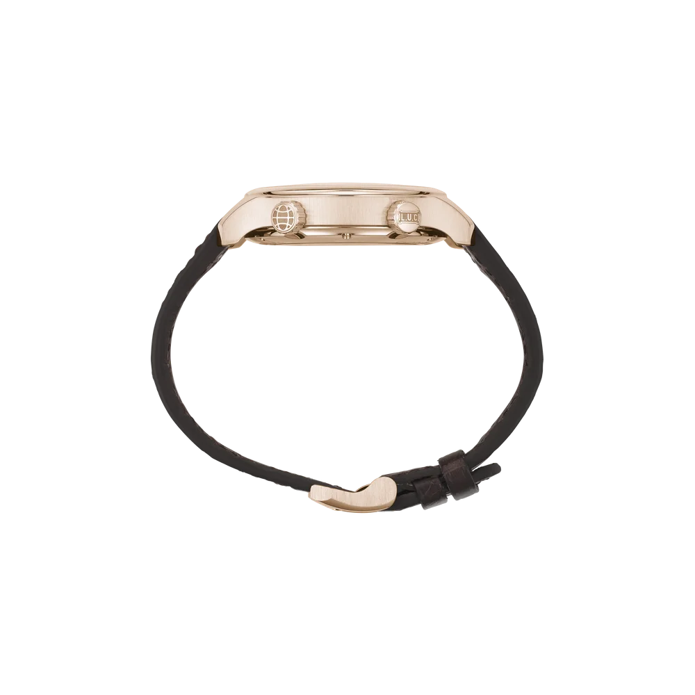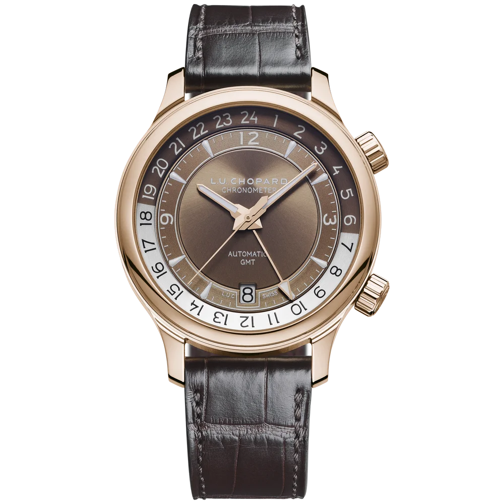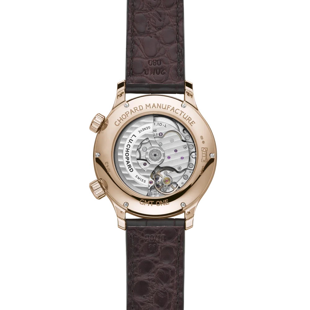 The Chopard L.U.C Time Traveler One Black 161943-5001 is has a Rose Gold case of 42mm, which houses the caliber L.U.C 01.10-L, a self-winding movement with GMT function. The dial is Brown.