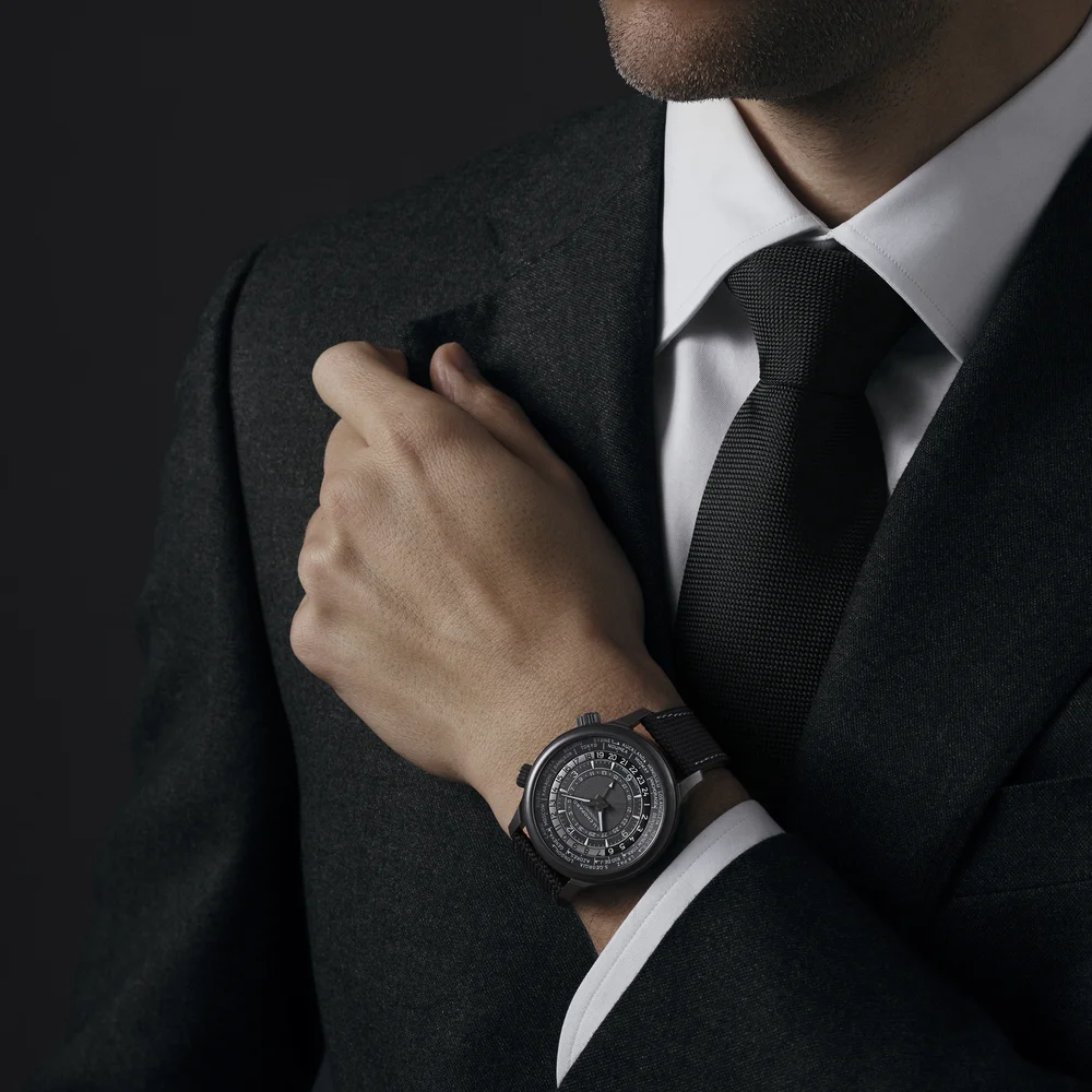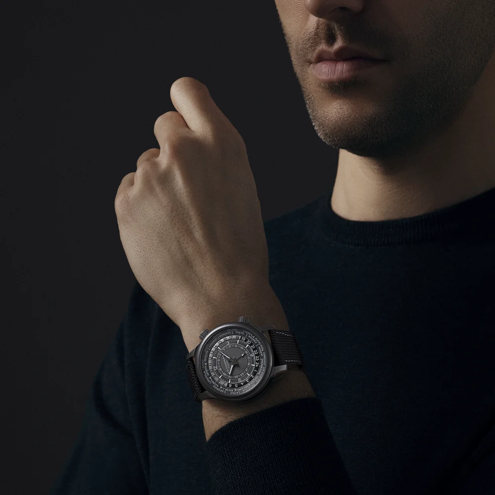 Case in ceramised grade 5 titanium, Crown at 2 o’clock serving to adjust the date and time of the second time zone, Crown at 4 o’clock serving to adjust the cities disc