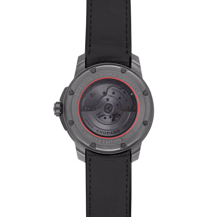 The Mille Miglia GTS Power Control Grigio Speciale impresses with impressive precision and performance. It is available in various shades of grey. The red accentuated details on the dial underline the contemporary design of this timepiece. The Mille Miglia GTS Power Control is made to adapt perfectly to the shape of the wrist and features an ultra-light titanium case with a diameter of 43 mm. It is a symbol of the Chopard spirit of the gentleman at the wheel.