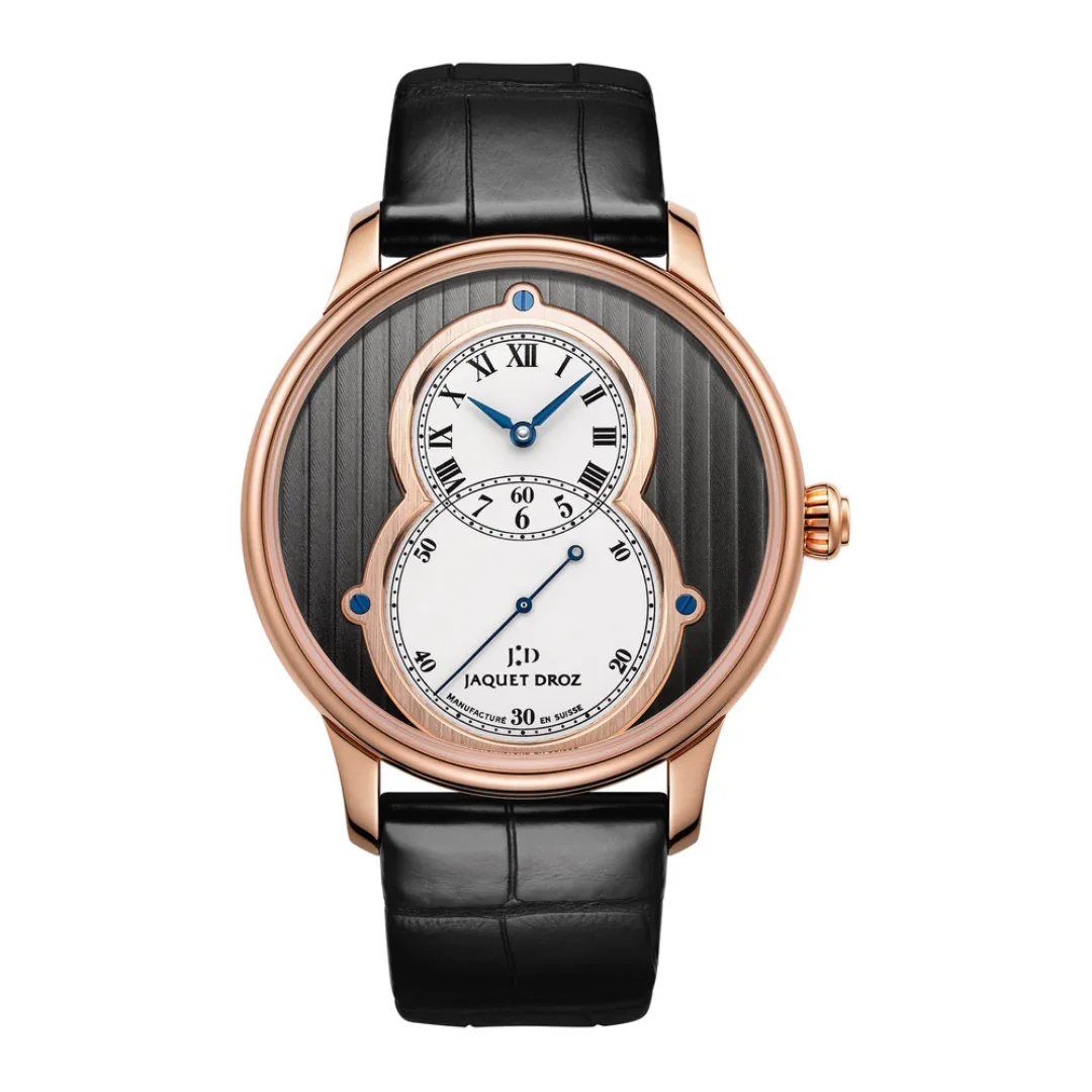 Reference J003033338, Côtes de Genève dial, silvered opaline subdial. 18-carat red gold case and ring. Self-winding mechanical movement. Power reserve of 68 hours. Diameter 43 mm. Movement: Jaquet Droz 2663, self-winding mechanical movement, double barrel, 22-carat white gold oscillating weight, Indications: Off-centered hours and minutes, large seconds subdial. The Grande Seconde is one of Jaquet Droz' signature models. The subdials of the off-center hours & minutes and small seconds overlap to form a poetic figure 8, a configuration based on historical pocket watches from the Jaquet Droz archives. The unusual mix of Roman and Arabic numerals is inspired by these pocket watches as well.The Grande Seconde J003033338 has Cotes de Geneve dial with silvered subdials.