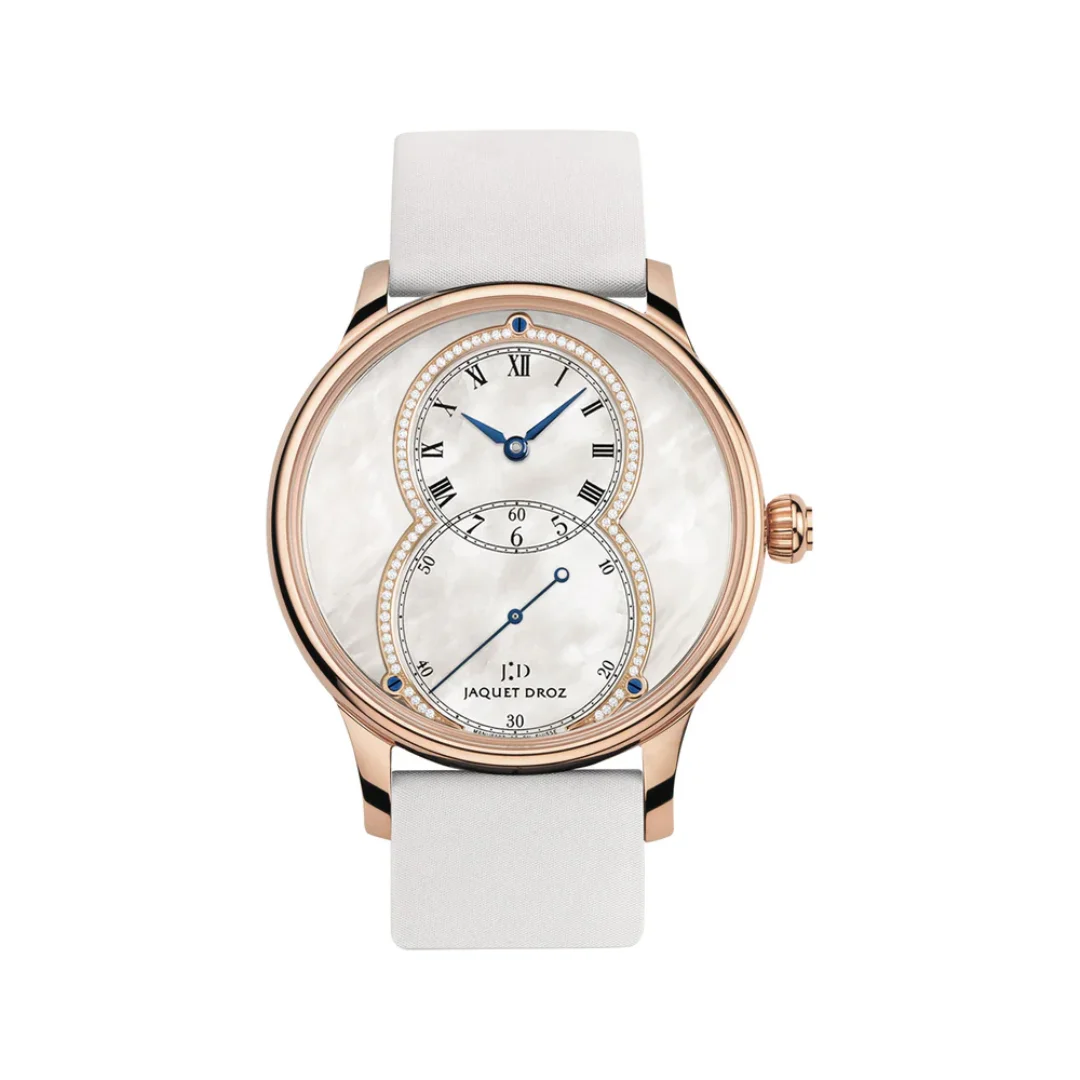 Reference: J014013228, White mother-of-pearl dial. 18-carat red gold case and ring. Ring set with 88 diamonds (0.191 carat). Self-winding mechanical movement. Power reserve of 68 hours. Diameter 39 mm. Movement: Jaquet Droz 2663, self-winding mechanical movement, double barrel, 22-carat white gold oscillating weight. The Grande Seconde is one of Jaquet Droz' signature models. The subdials of the off-center hours & minutes and small seconds overlap to form a poetic figure 8, a configuration based on historical pocket watches from the Jaquet Droz archives. The unusual mix of Roman and Arabic numerals is inspired by these pocket watches as well.