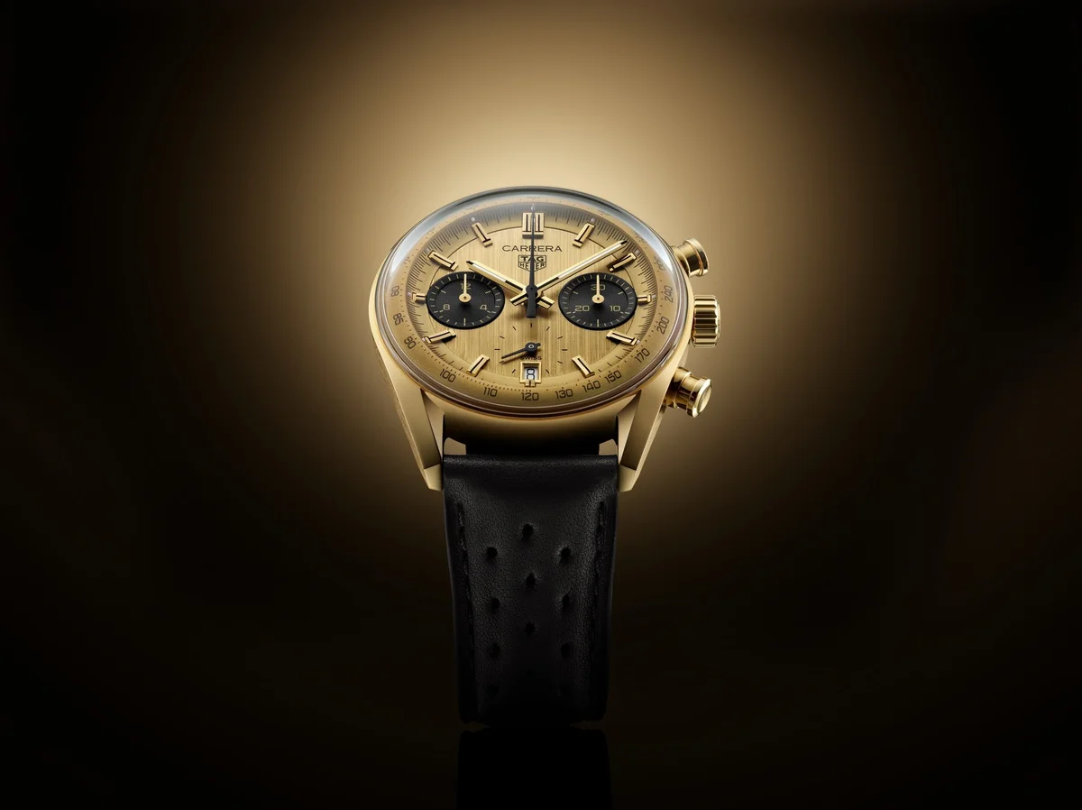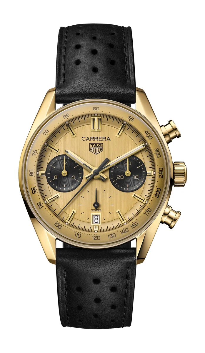 In the 1960s, the first glass box TAG Heuer Carrera was born. In this version of the mythical watch, the 18K 3N solid gold construction of the case and dial adds a luxurious edge to this iconic racer.