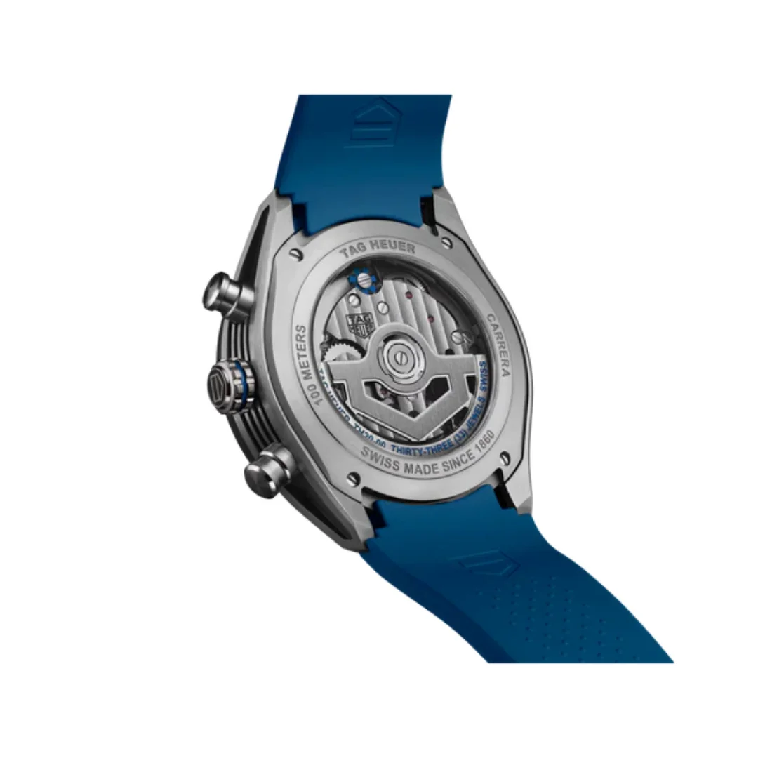 With the TAG Heuer Carrera Chronograph, which embodies the thrill of motorsport, you can turn the spotlight on your wrist. With its bold design and blue accents, the skeletonized dial of this timepiece captures the essence of speed and innovation. Ready to speed off in style.