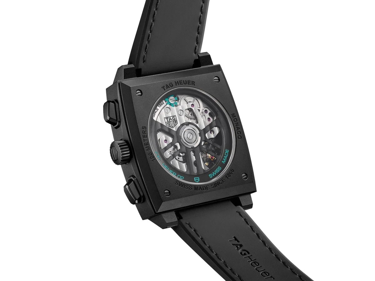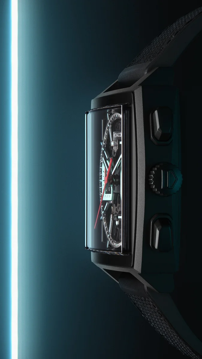 Bold avant-garde design features and irreverent looks make up this unique TAG Heuer Monaco. Its vivid turquoise touches stand out superbly against the black dial, while the technical Calibre Heuer 02 ensures extreme precision. Fierce and unruly.