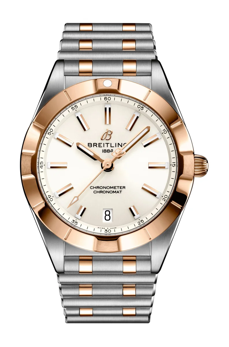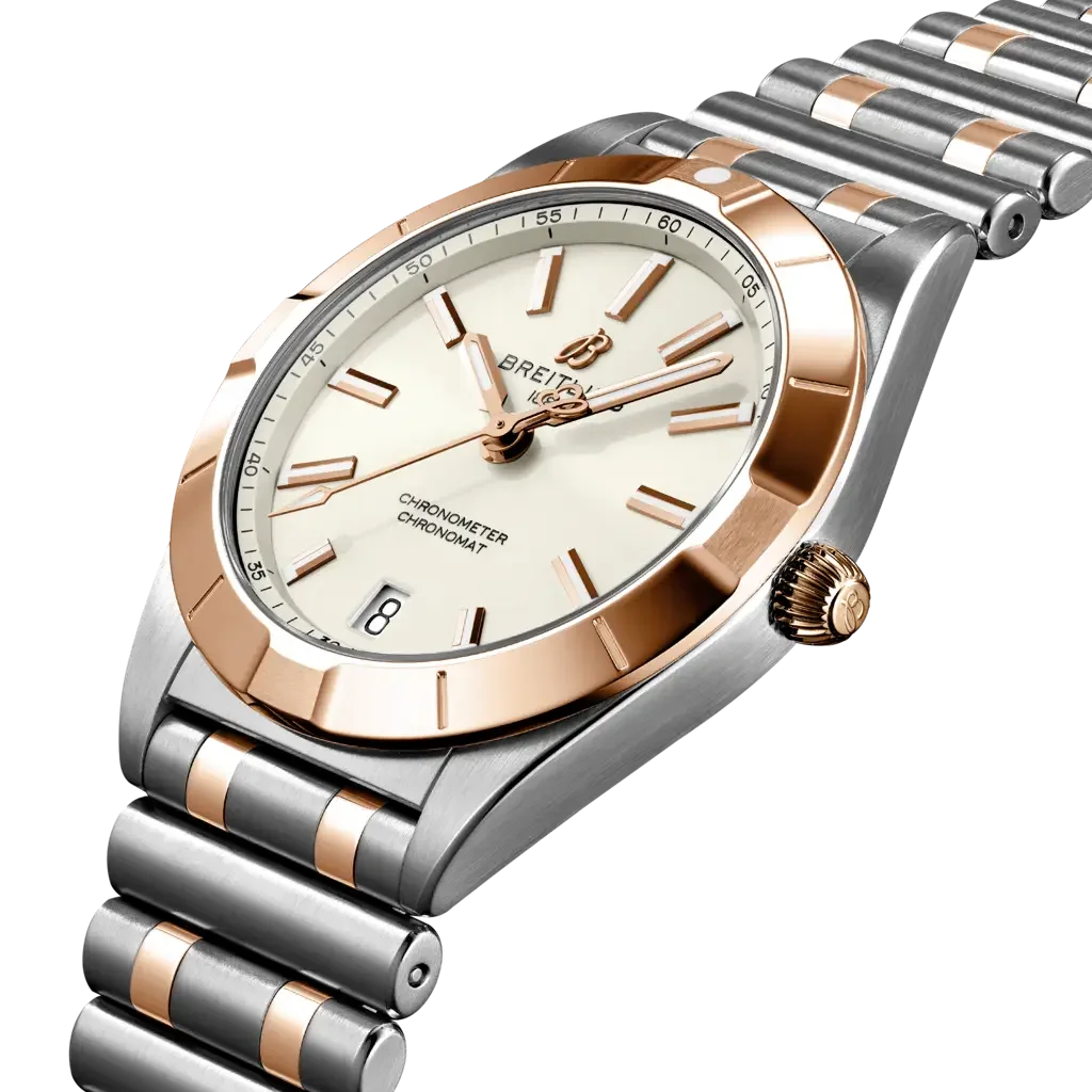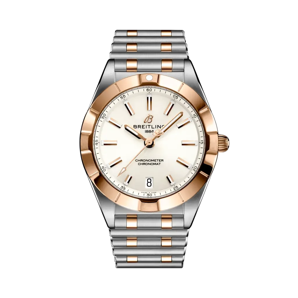 The Breitling Chronomat Automatic 32 reference U77310101A1U1 has a stainless steel & red gold case paired with a matching Rouleaux bracelet. The dial is White. Inside ticks the SuperQuartz caliber Caliber 77.