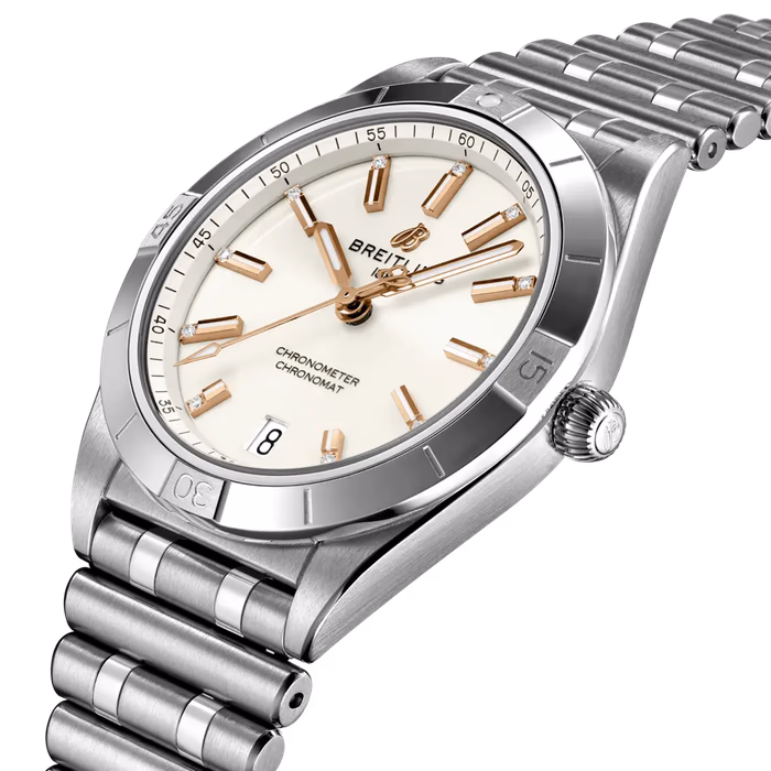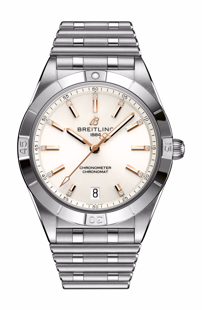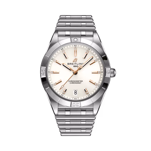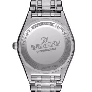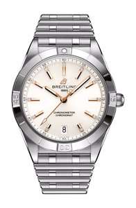 The Breitling Chronomat Automatic 36 reference A10380101A2A1 has a stainless steel case paired with a matching Rouleaux bracelet. The dial is White. Inside ticks the self-winding caliber Caliber 10.