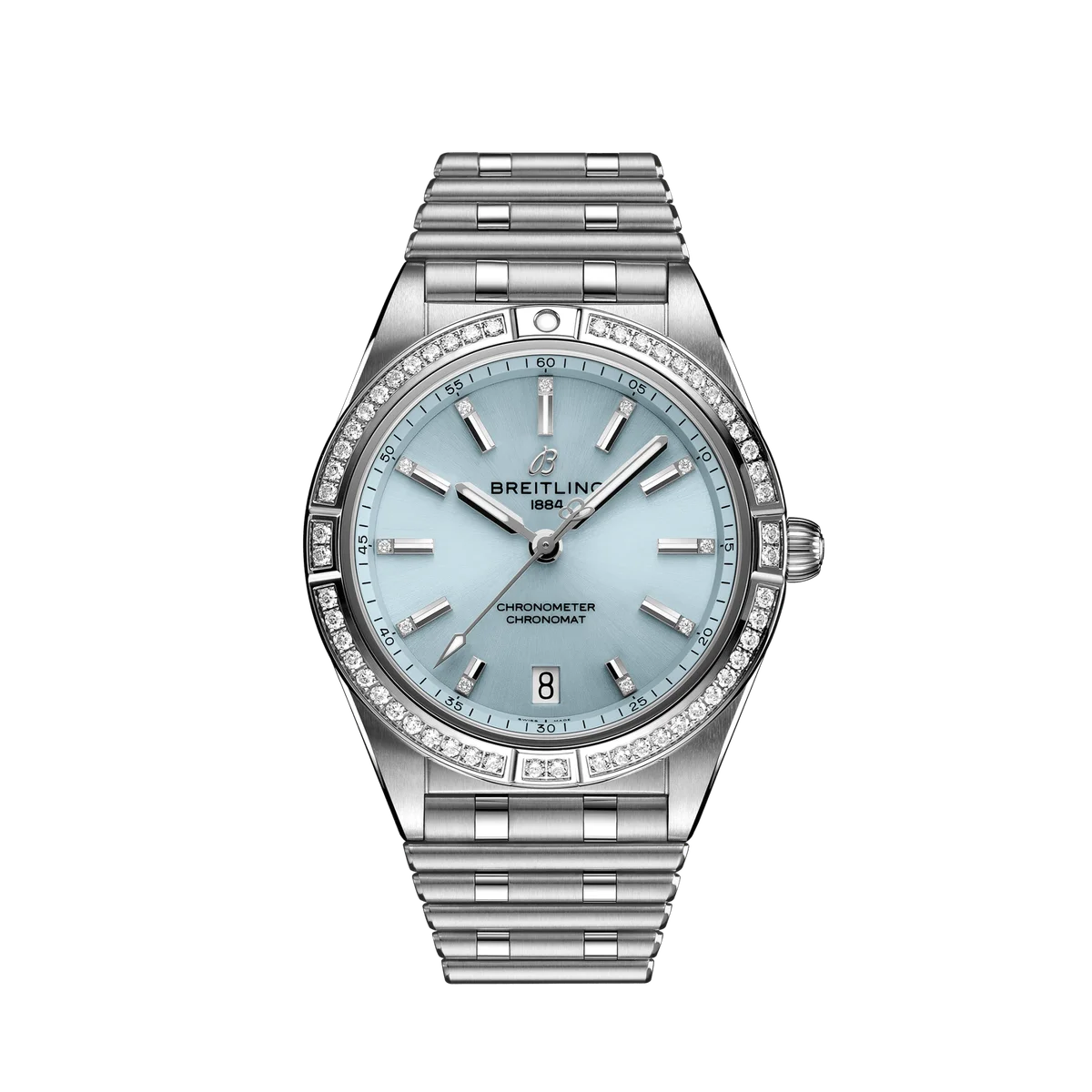 The Breitling Chronomat Automatic 36 reference G10380591C1G1 has a stainless steel case with a white gold diamond-set bezel. The dial is ice Blue. Inside ticks the self-winding caliber Caliber 10. It is available in an array of metal cases, from cool stainless steel, to goes-with-everything bicolor, or even luxurious 18k red gold. Women craving extra sparkle will also be able to opt for diamond-set bezels, indices, and colorful dials.