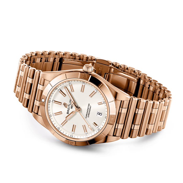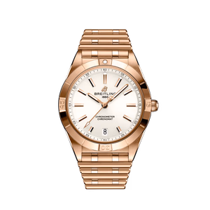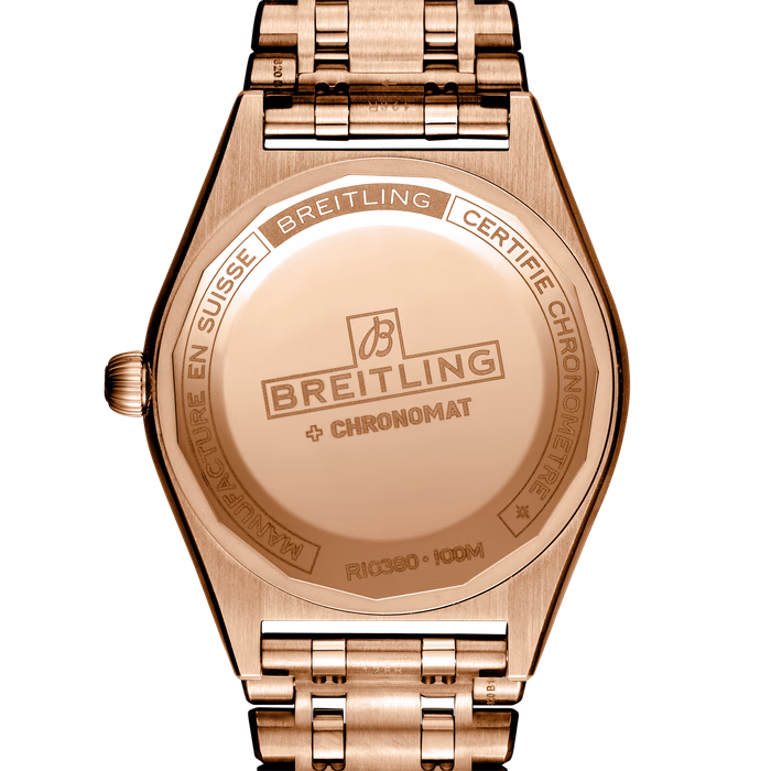 The Breitling Chronomat Automatic 36 reference R10380101A1R1 has a red gold case paired with a matching Rouleaux bracelet. The dial is White. Inside ticks the self-winding caliber Caliber 10. Stylish yet elegant, the modern-retro inspired Chronomat Automatic 36 is the versatile sporty and chic watch for any occasion. It is available in an array of metal cases, from cool stainless steel, to goes-with-everything bicolor, or even luxurious 18k red gold. Women craving extra sparkle will also be able to opt for diamond-set bezels, indices, and colorful dials. Featuring Breitling’s iconic and comfortable “Rouleaux” bracelet with a butterfly clasp, the Chronomat Automatic 36 is powered by the Breitling Caliber 10