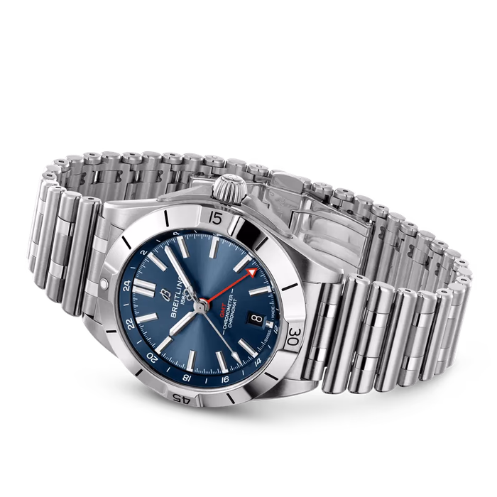 The Breitling Chronomat 40 GMT was introduced in 2022. This Chronomast has a case of 40.00, housing a self-winding movement with GMT function (caliber Caliber 32). For reference A32398101C1A1, the dial is Blue. The Chronomat Automatic GMT 40 is Breitling’s tribute to travel, not only for its dual time zone display, but also because of its easygoing aesthetics. Subtle dial colors, combined with an all-steel case and bracelet, work with any wardrobe. Meanwhile, the tone-on-tone 24-hour scale lets the red GMT hand speak for itself. The Breitling Caliber 32 powers the GMT complication. Its 24-hour scale lets the user track a second time zone and know at a glance whether it’s day or night