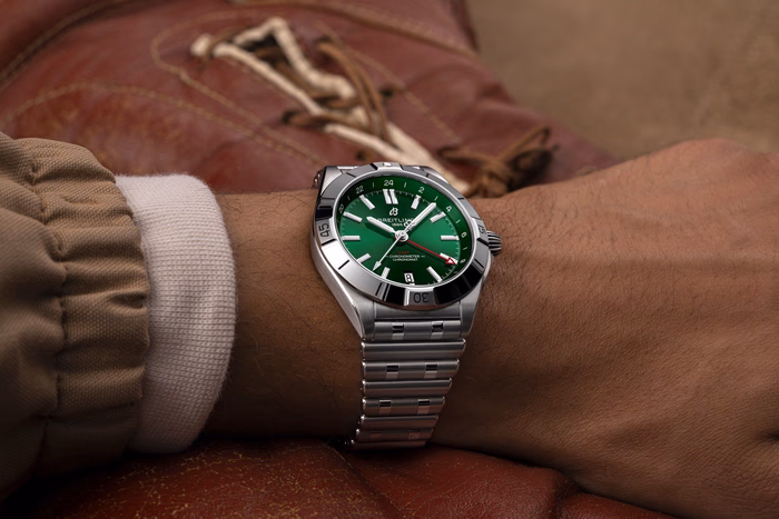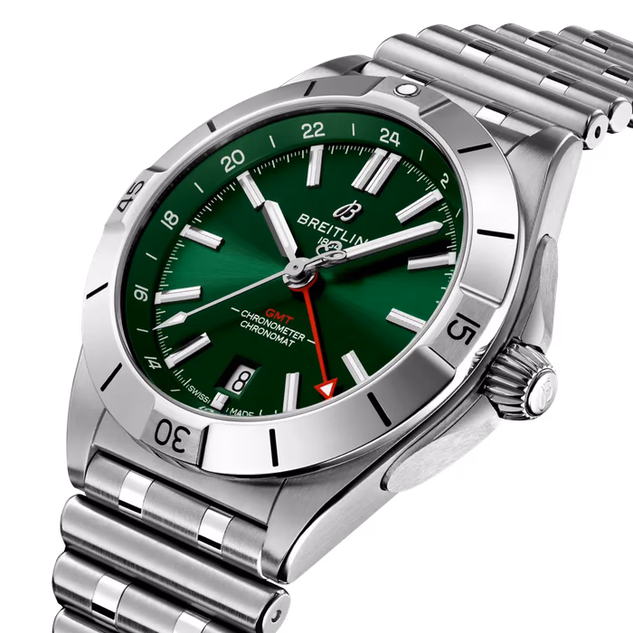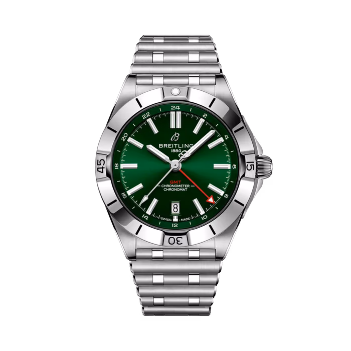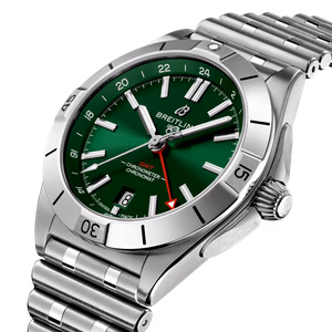 The Breitling Chronomat 40 GMT was introduced in 2022. This Chronomast has a case of 40.00, housing a self-winding movement with GMT function (caliber Caliber 32). For reference A32398101L1A1, the dial is Green.