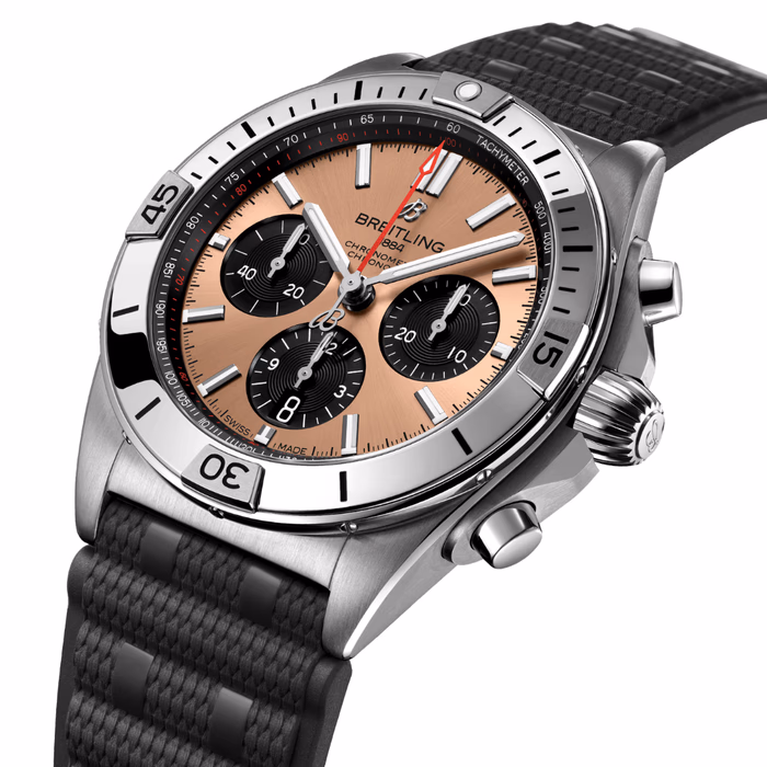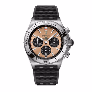The Chronomat holds a significant place in Breitling’s history. Introduced in 1984, at a time where extra-thin quartz timepieces were the order of the day, Breitling placed a bold bet on an impressively proportioned mechanical watch. Available in a variety of materials from stainless steel to luxurious 18 k red gold, the Chronomat features a 42 mm case and the iconic bezel with the four rider tabs. Available in a range of colorful dials, the Chronomat is matched to the signature “Rouleaux” bracelet in metal or rubber and is powered by the in-house Breitling Manufacture Caliber 01.