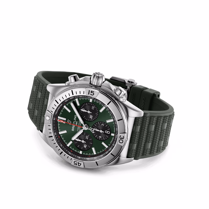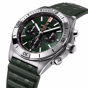 The Chronomat holds a significant place in Breitling’s history. Introduced in 1984, at a time where extra-thin quartz timepieces were the order of the day, Breitling placed a bold bet on an impressively proportioned mechanical watch. Available in a variety of materials from stainless steel to luxurious 18 k red gold, the Chronomat features a 42 mm case and the iconic bezel with the four rider tabs. Available in a range of colorful dials, the Chronomat is matched to the signature “Rouleaux” bracelet in metal or rubber and is powered by the in-house Breitling Manufacture Caliber 01.