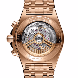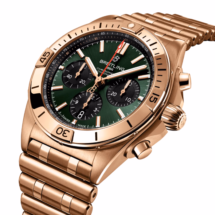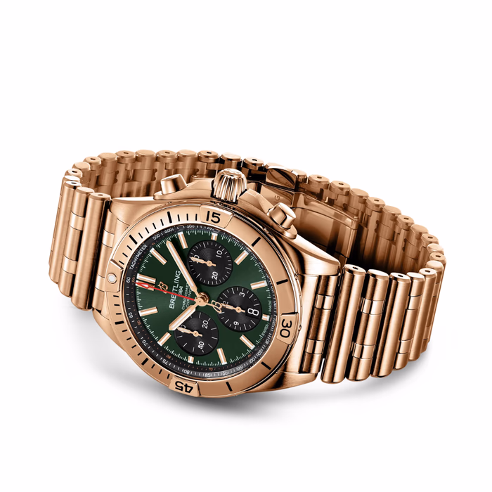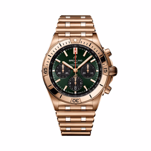 The Breitling Chronomat B01 42 was introduced in 2020. A complete revamp of Breitling's evergreen, this new version sports a sleeker case with more clearly defined angles, a redesigned bezel, and the option of a brand-new 'Rouleaux' style bracelet. Inside ticks Breitling's in-house B01 movement. Reference RB0134101L1R1 has a red gold case and a Green dial. It is water resistant up to 200m.