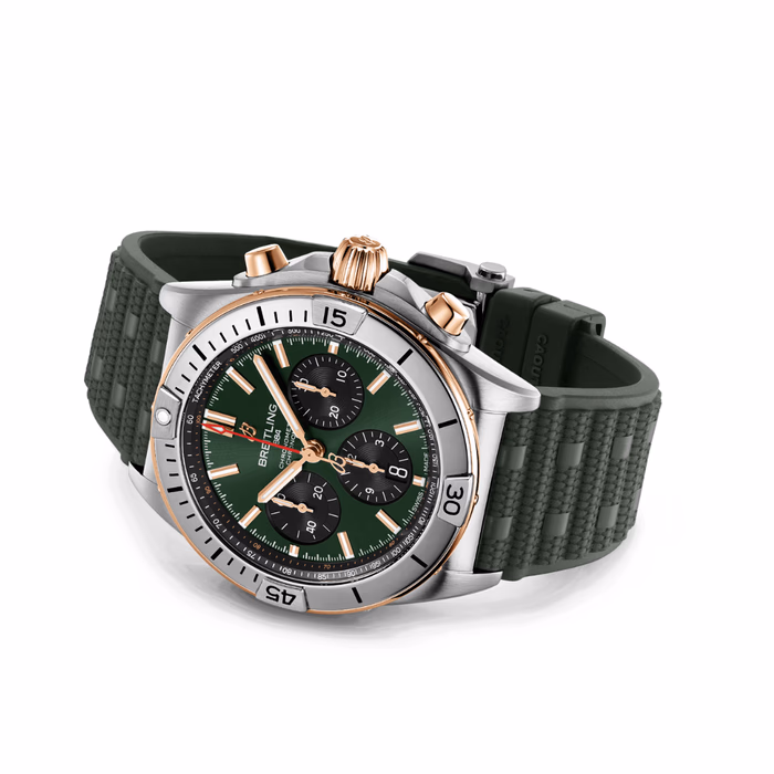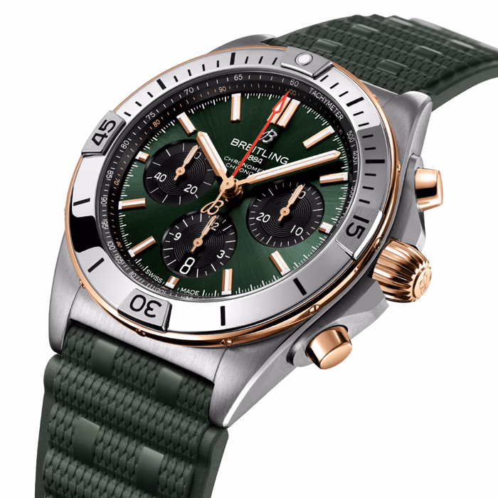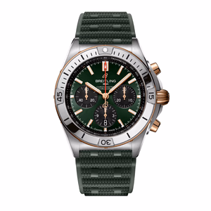 The Chronomat holds a significant place in Breitling’s history. Introduced in 1984, at a time where extra-thin quartz timepieces were the order of the day, Breitling placed a bold bet on an impressively proportioned mechanical watch. Available in a variety of materials from stainless steel to luxurious 18 k red gold, the Chronomat features a 42 mm case and the iconic bezel with the four rider tabs. Available in a range of colorful dials, the Chronomat is matched to the signature “Rouleaux” bracelet in metal or rubber and is powered by the in-house Breitling Manufacture Caliber 01.