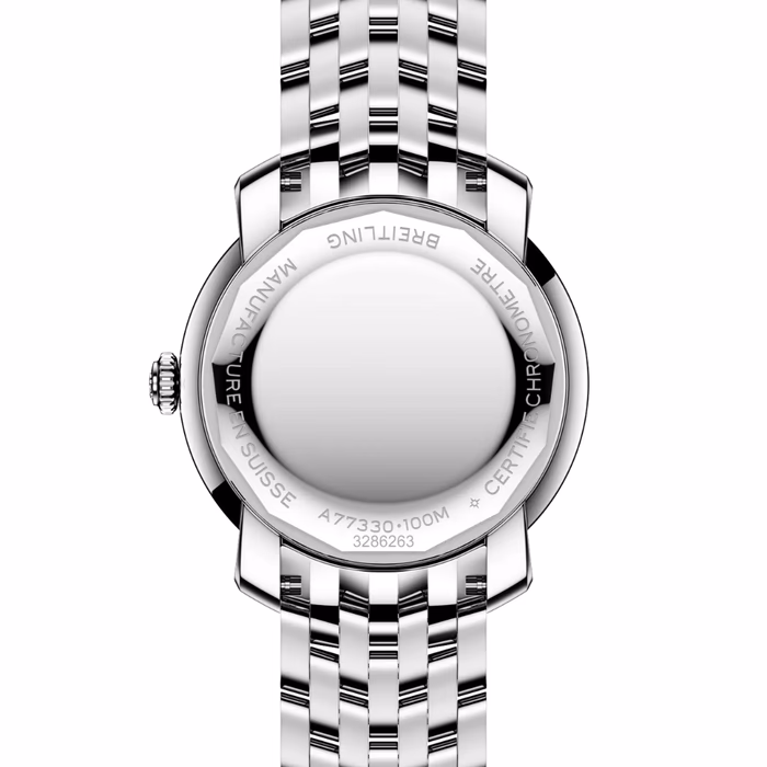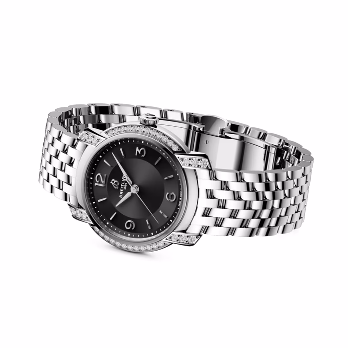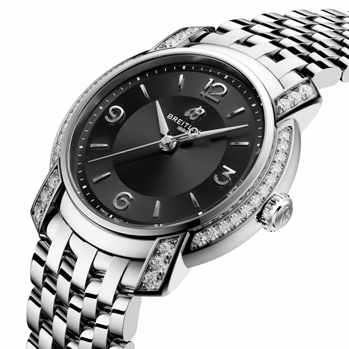 Lady Premier 32 Ref. A77330671B1A1 . In 2025, Breitling brings that unscripted elegance into the present with the new Lady Premier. Sculptural silhouettes, radiant hues, and cascading diamonds define its playful yet elevated design language. Minimalist numerals, lozenge hands, and a sculptural crown enhance its jewelry-like appeal. The 32 mm editions debut a new tapered seven-row Chevron bracelet—a feminine twist on the men’s Premier—combined with the precision of the COSC-certified Caliber 77 SuperQuartz™ movement.