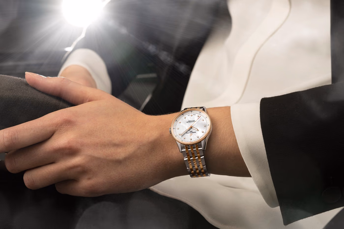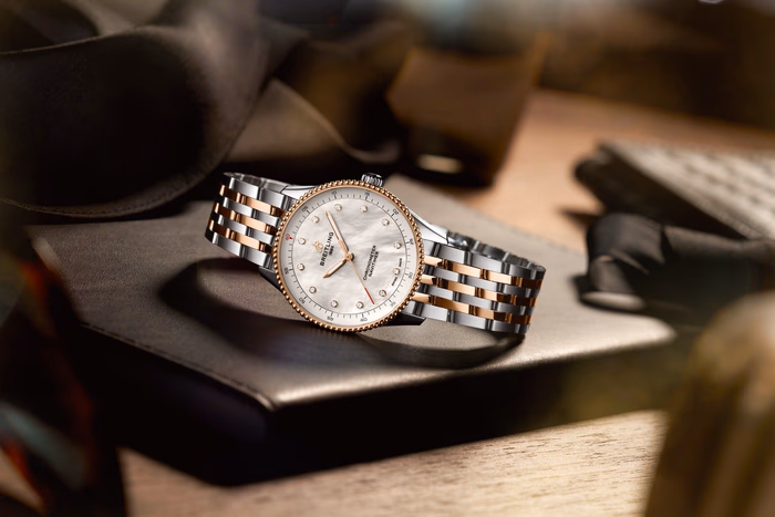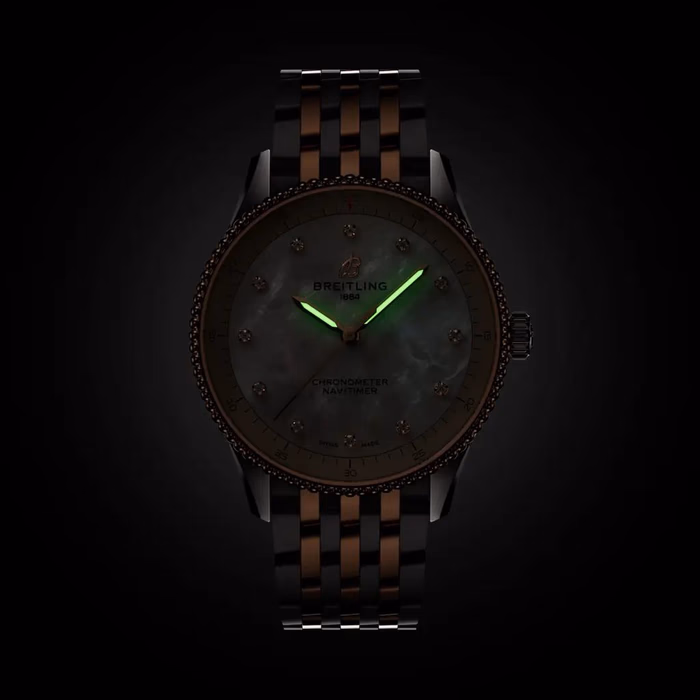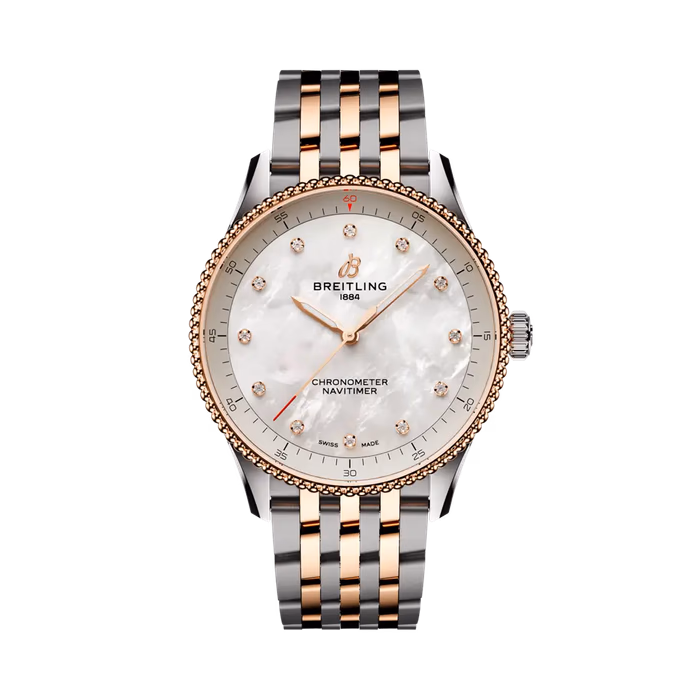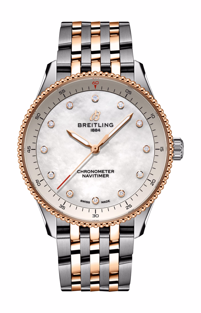 The Breitling Navitimer Quartz 32 U77320E61A1U1 debuted in 2023. This Navitimer has a stainless steel & red gold case of 32.00mm, which houses a quartz movement in the form of Caliber 77. The dial is White mother-of-pearl with diamond-set hour markers.