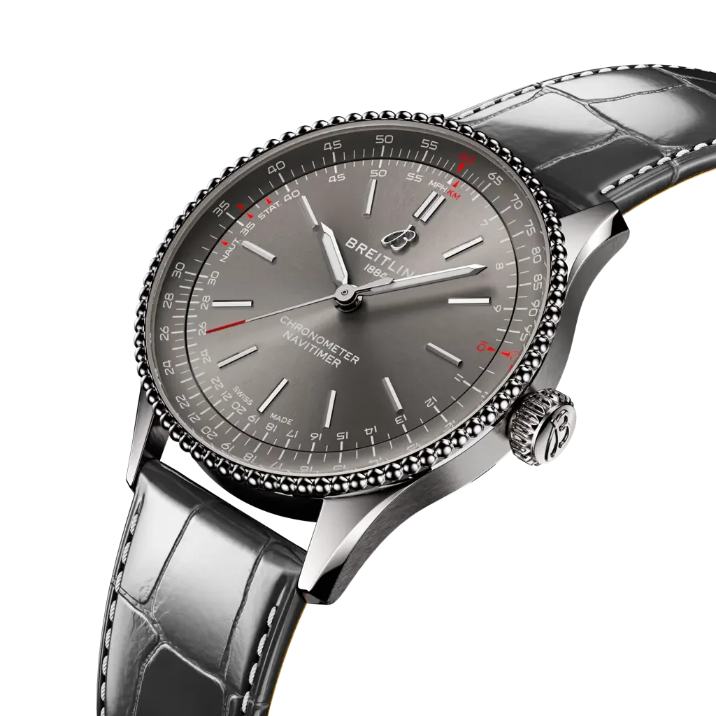 The Breitling Navitimer Automatic 36 A17327381B1P1 debuted in 2023. This Navitimer has a Stainless Steel case of 36.00mm, which houses the self-winding caliber Caliber 17 ND. The dial is Grey.